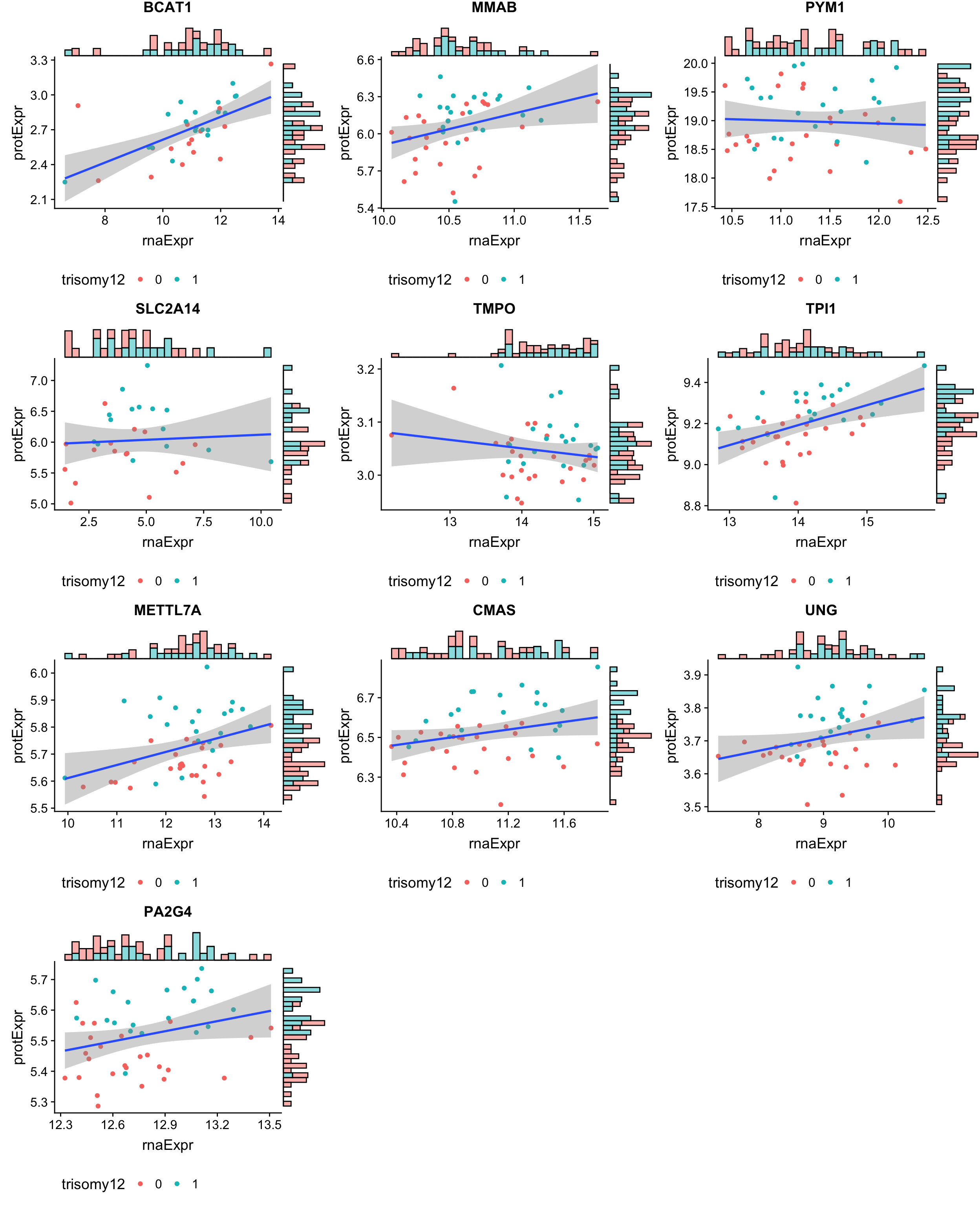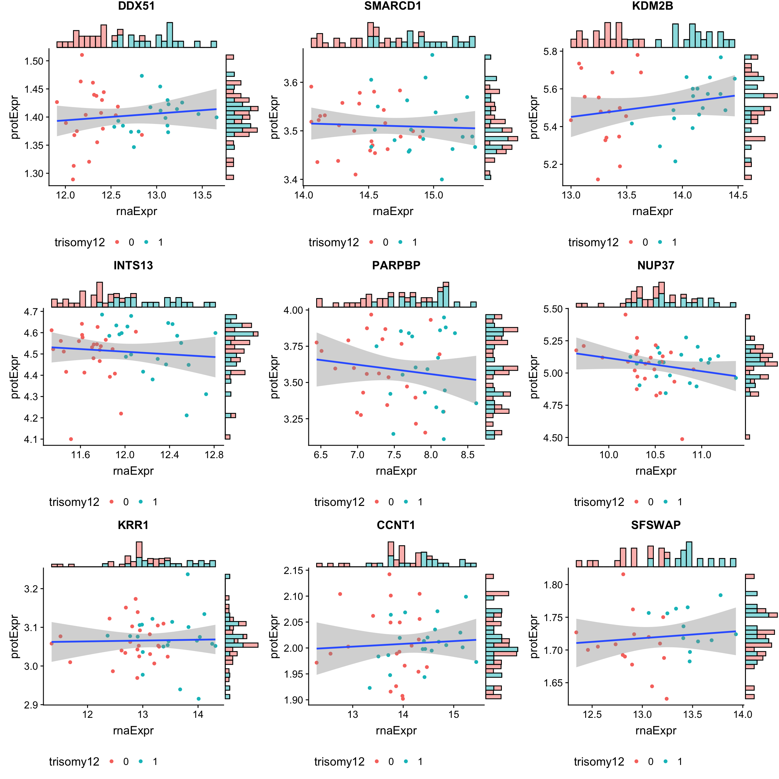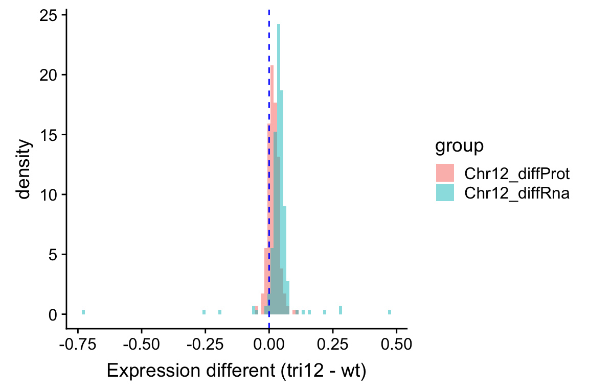 The gene dosage effect is visible in both RNA expression and protein expression, as compared to WT samples, the genes on Chr12 show elevated global expression of both RNA and protein in trisomy12 sample. But the scale of difference is less in proteins and the protein expression is less varied than RNA expression. This may be due to the buffering or moderation effect of translation or some other mechanisms that regulate protein abundance.
