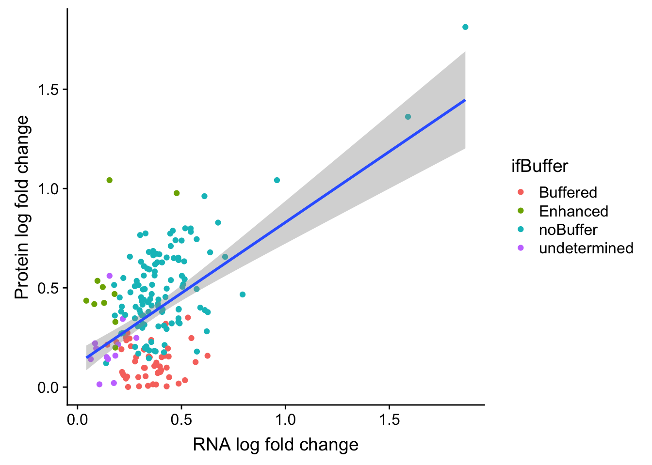 In this plot, the y axis in the log fold change of either protein (blue) or RNA (orange) expression (trisomy12 vs WT). If there’s a “Buffering” effect, the protein and rna is connected by a red dotted line. If there’s an “Enhanced” effect, they will be joined by a green dotted line.