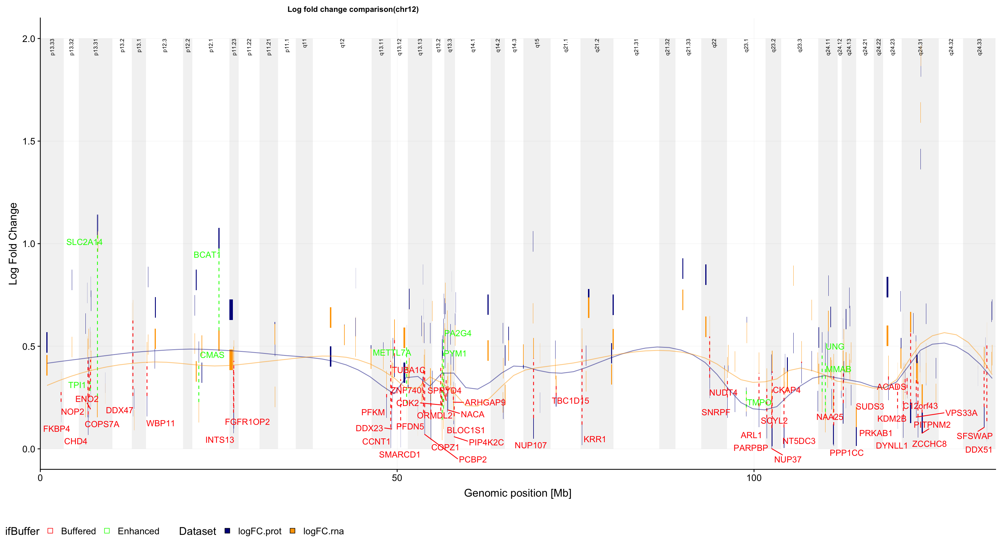 g <- plotFoldGenome(bufferTab, allBand, allProtTab, "chr12", region = c(-Inf,Inf),
