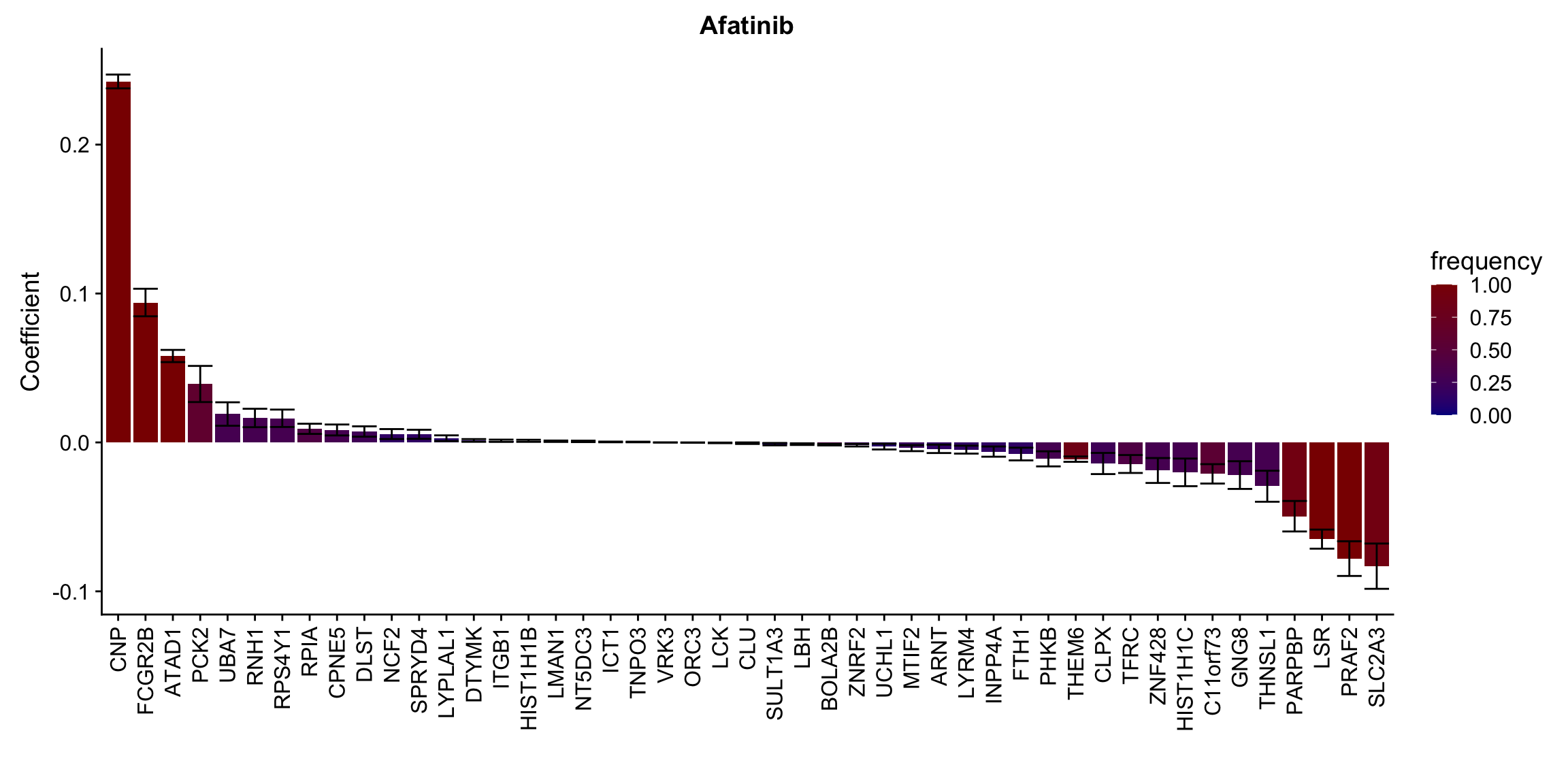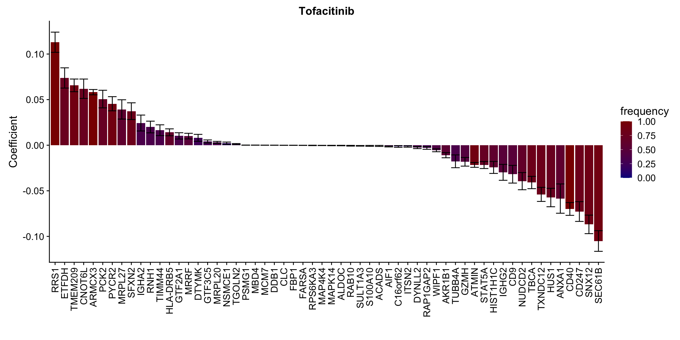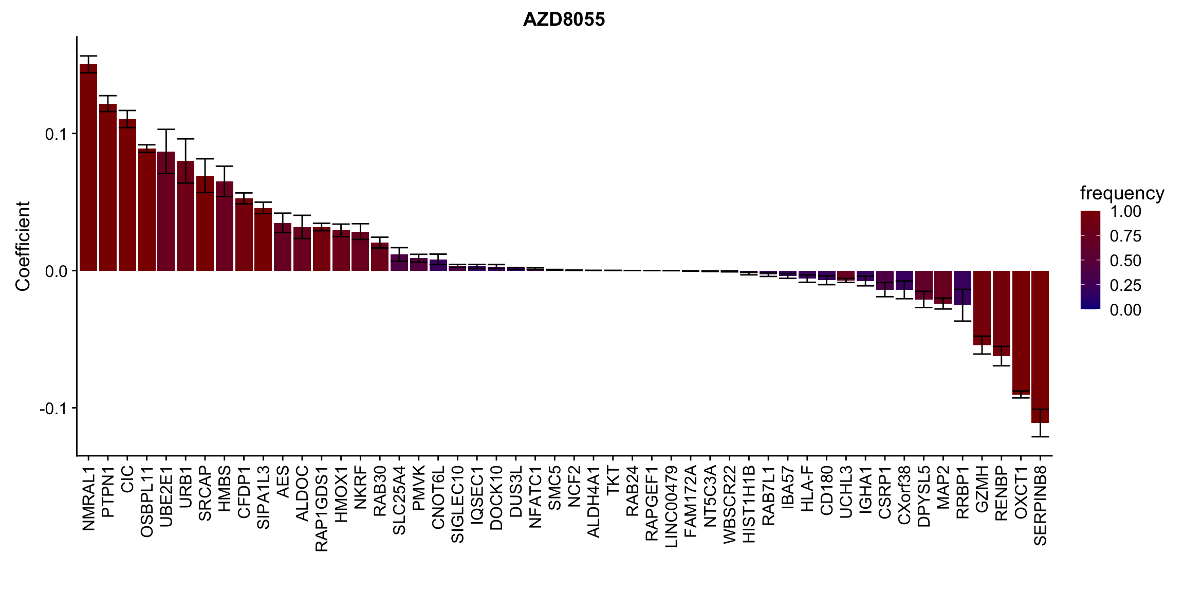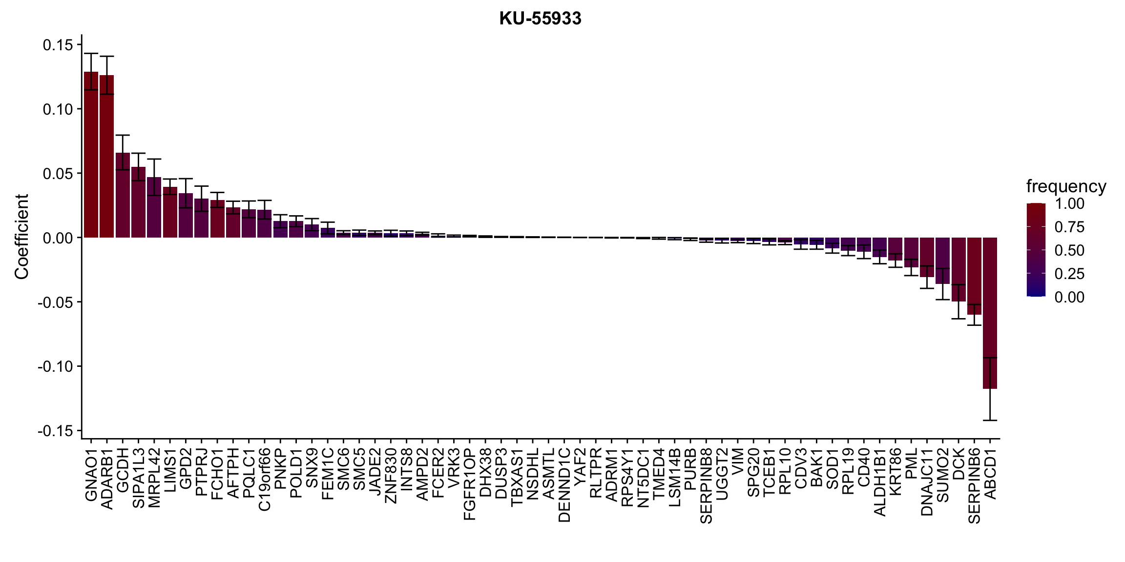 ggplot(plotTab, aes(x=symbol,y=meanCoef,fill = freq)) +