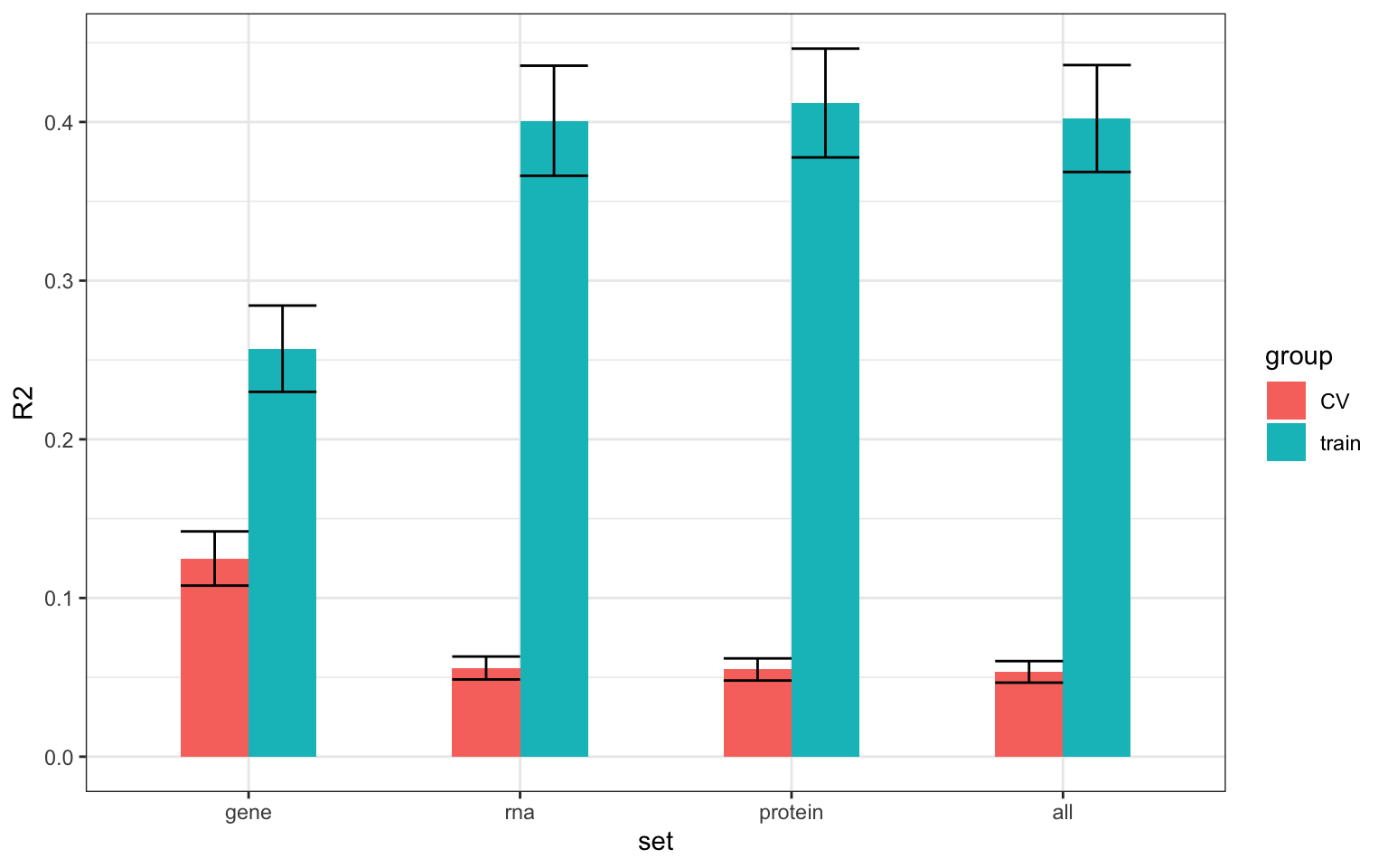 geom_bar(stat = "identity") + geom_errorbar(aes(ymax=meanCoef+semCoef, ymin = meanCoef-semCoef)) +