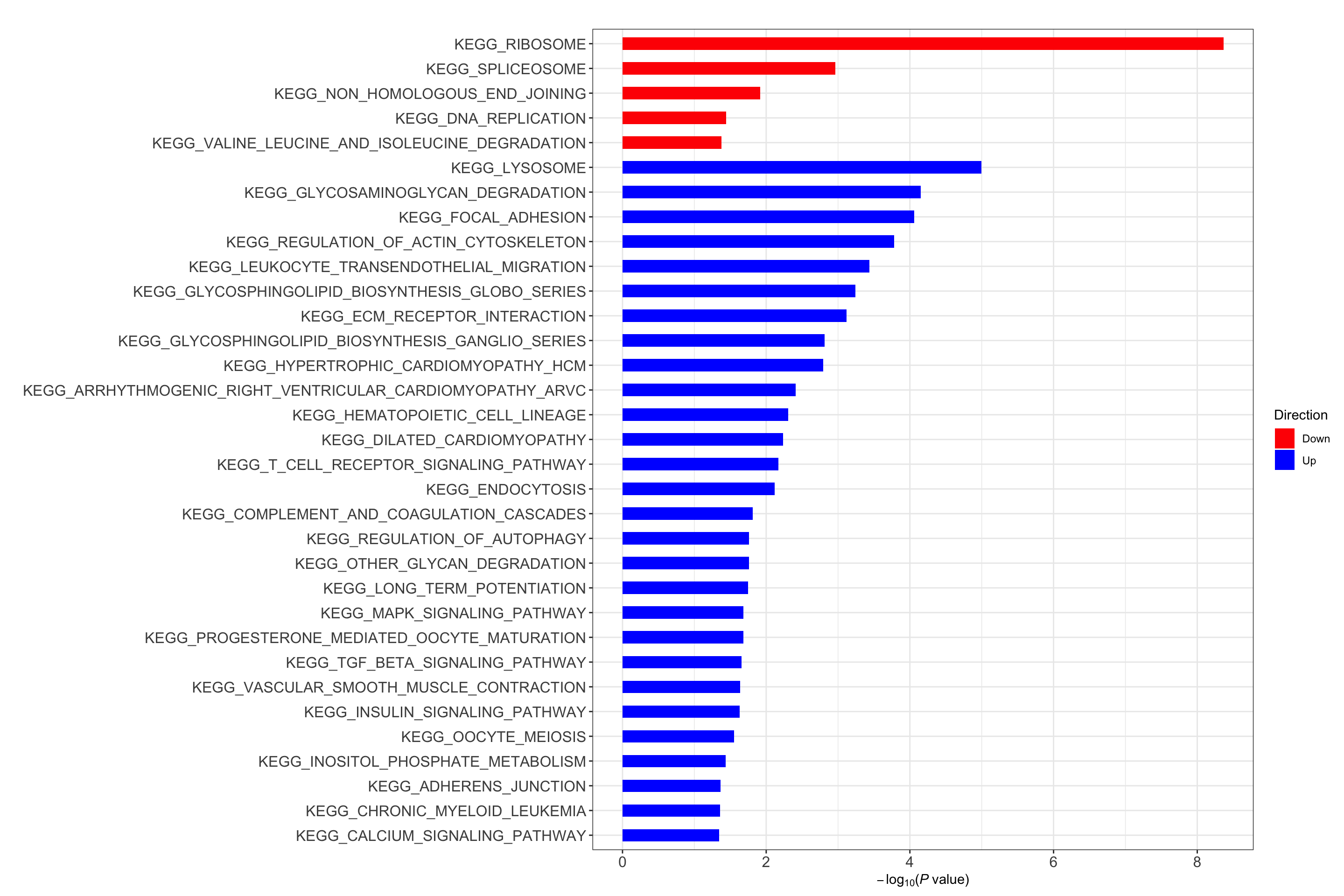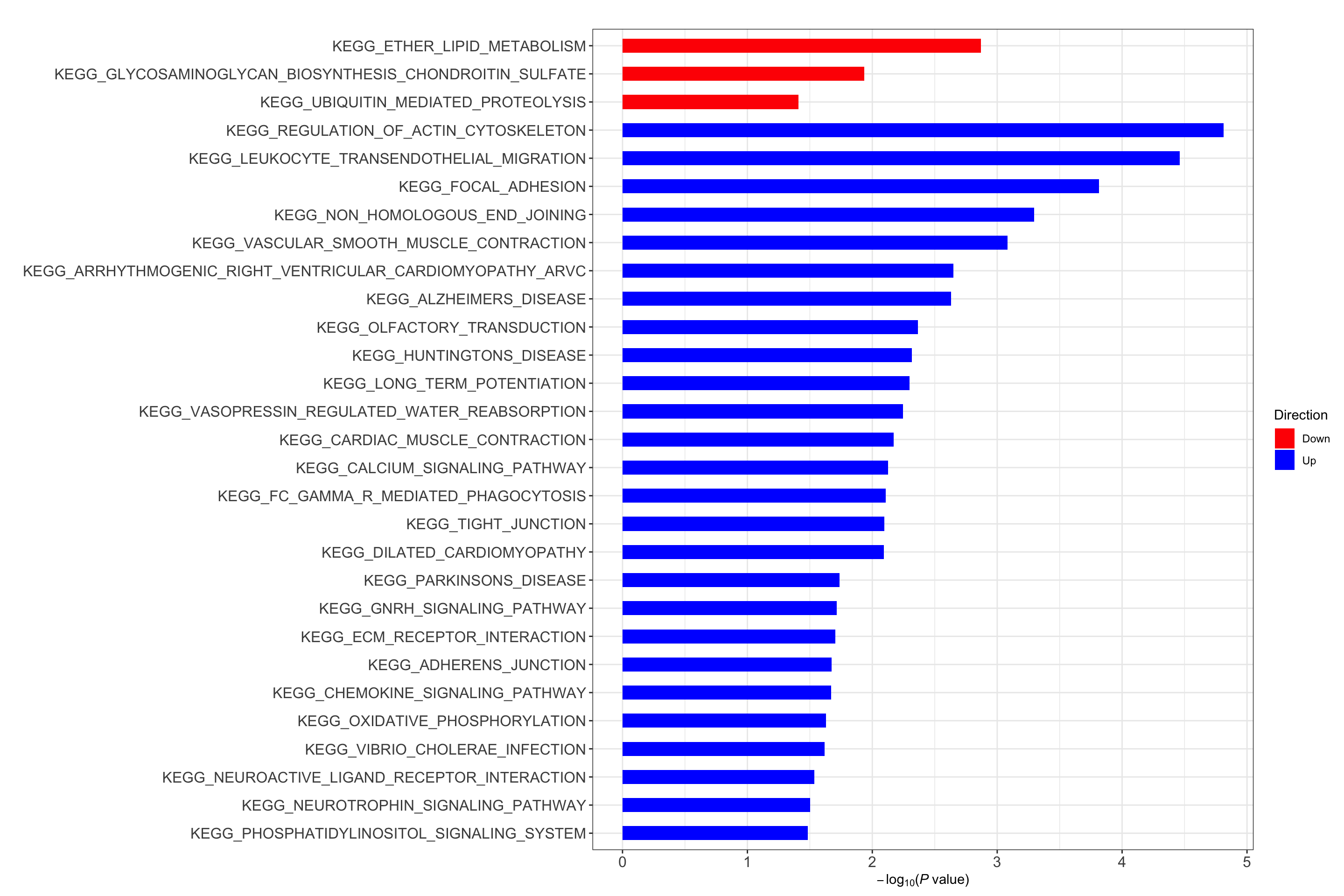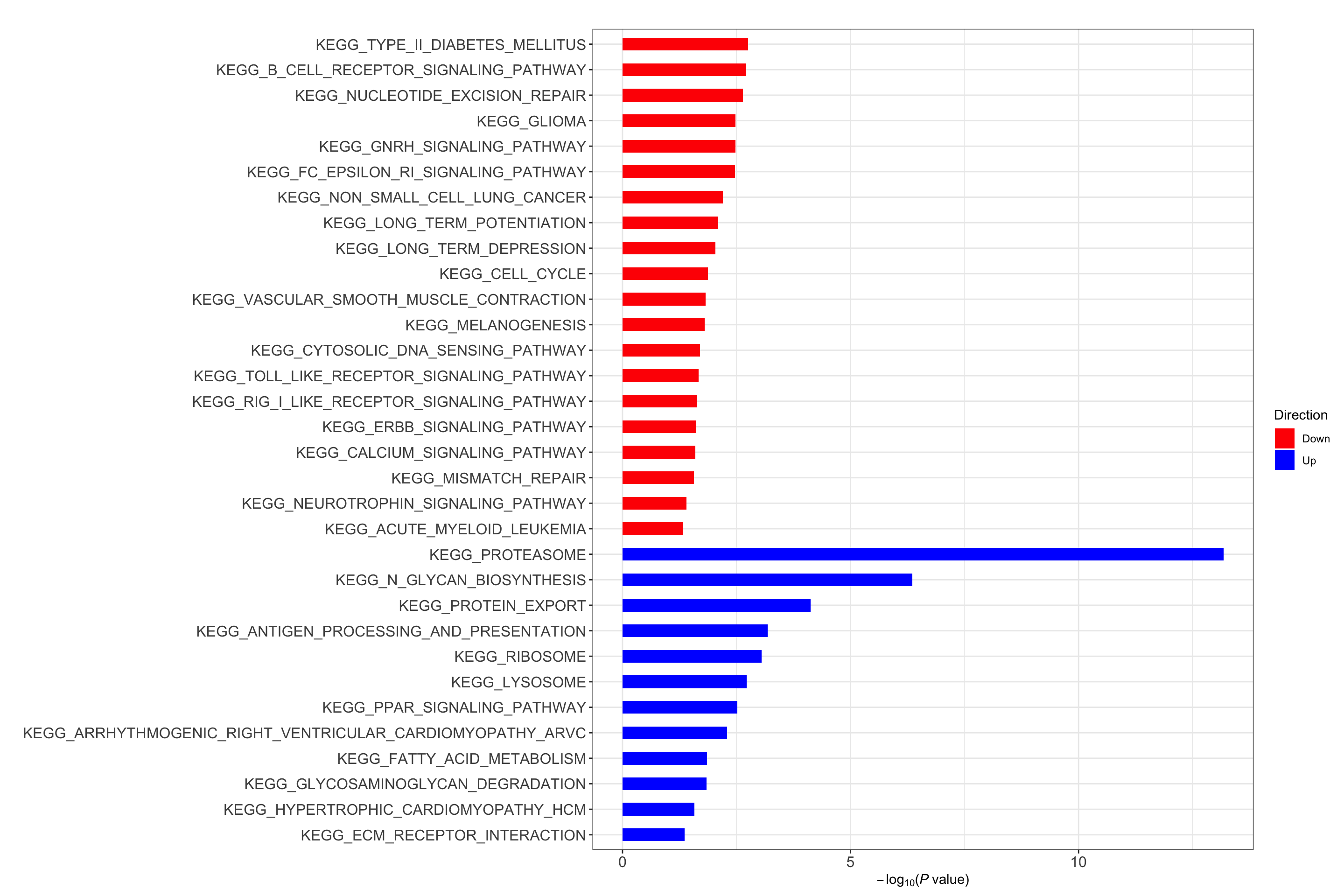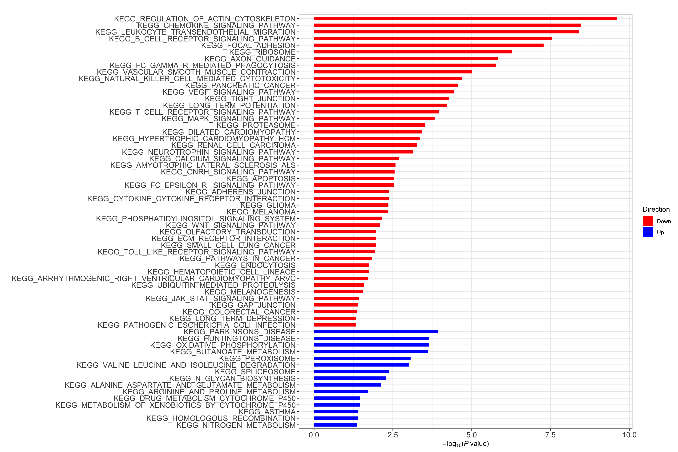 res <- runCamera(proMat, designMat, gmts$KEGG, id = rowData(protCLL[rownames(proMat),])$hgnc_symbol)