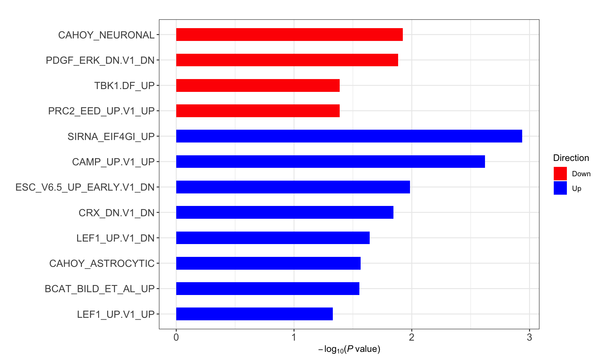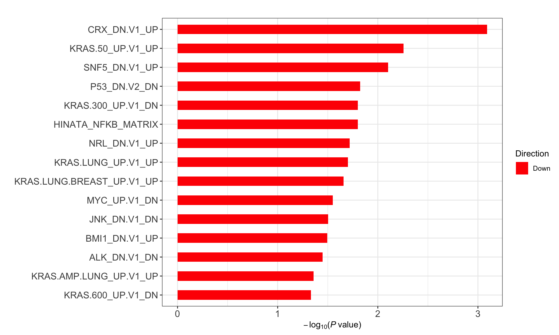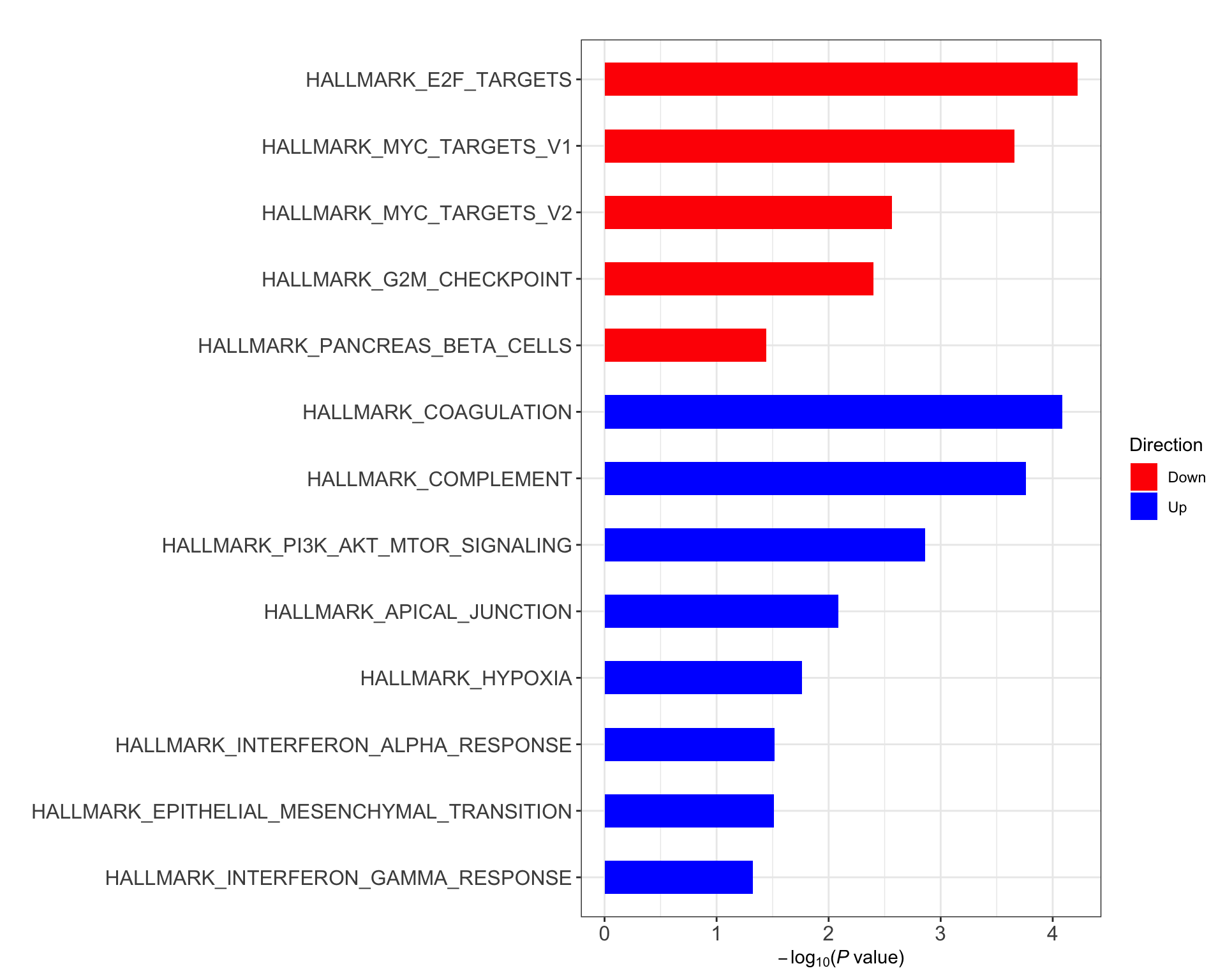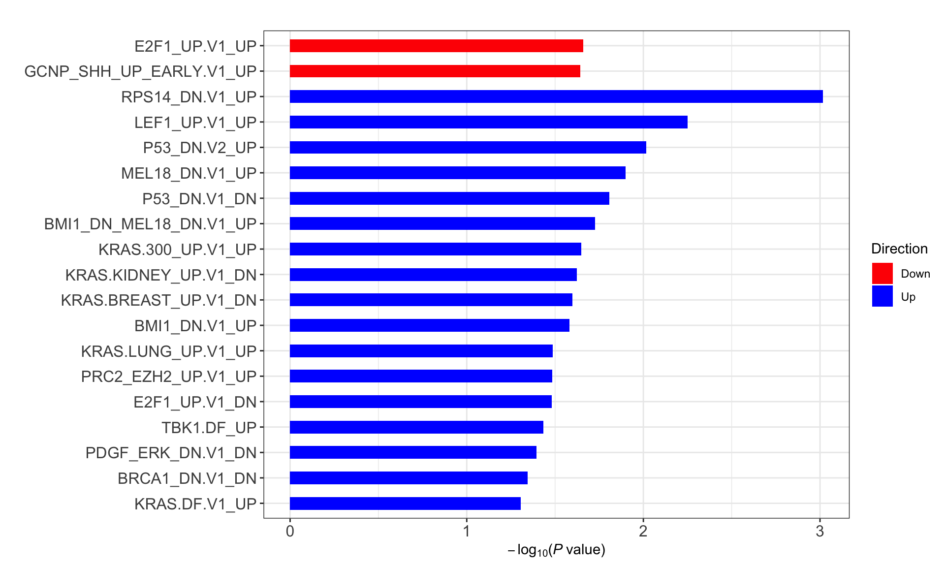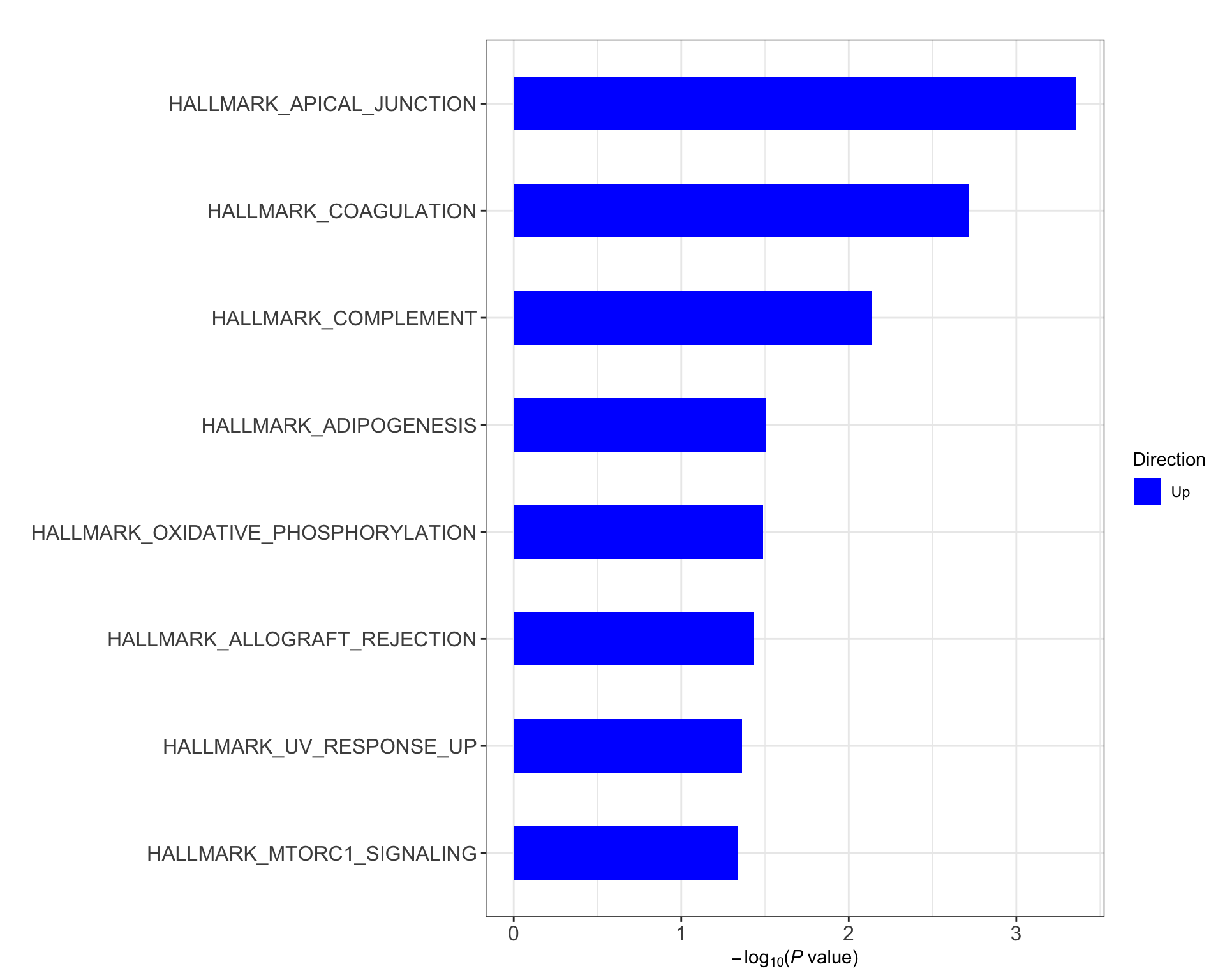 res <- runCamera(proMat, designMat, gmts$C6, id = rowData(protCLL[rownames(proMat),])$hgnc_symbol)