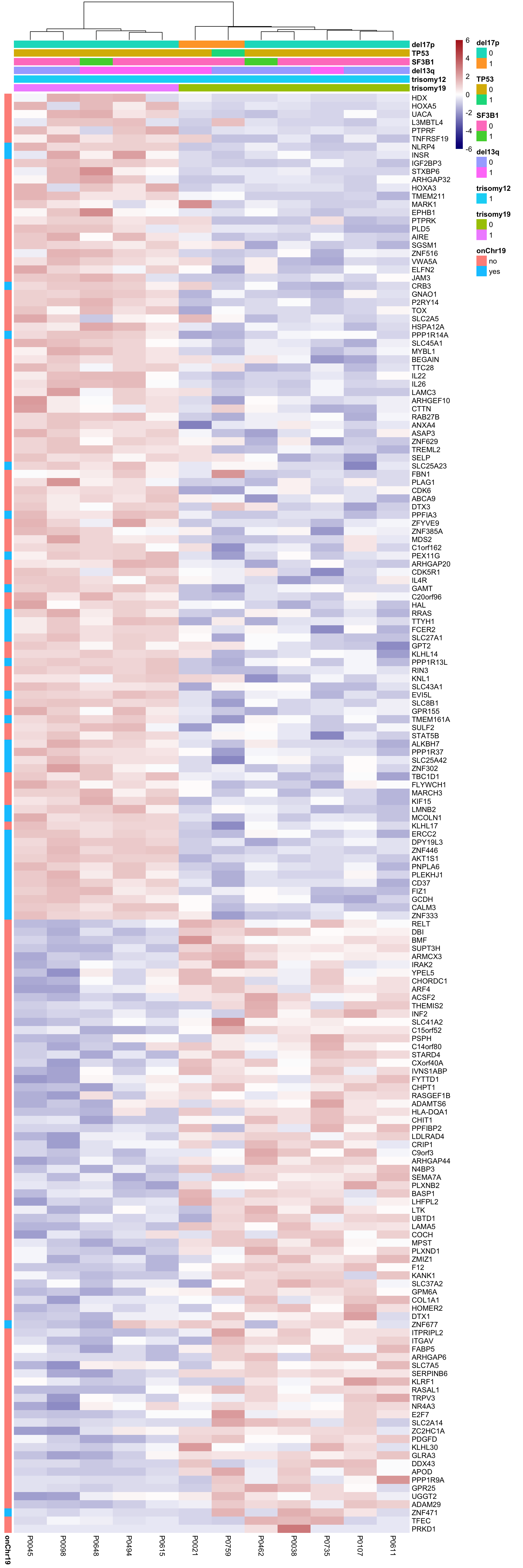 Check the distribution of several recurrent mutations that impact gene expression (based on Almut’s paper), namely: del13q, SF3B1, del17p, TP53, del11q, BRAF, gain8q, del8p, NOTCH1, MED12, ATM.