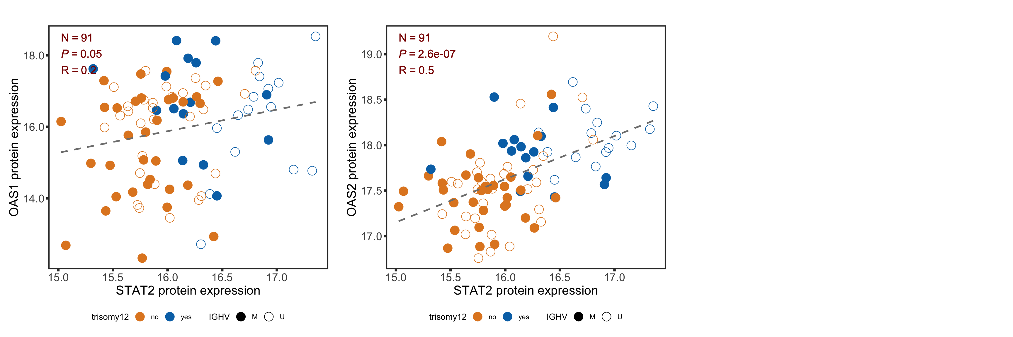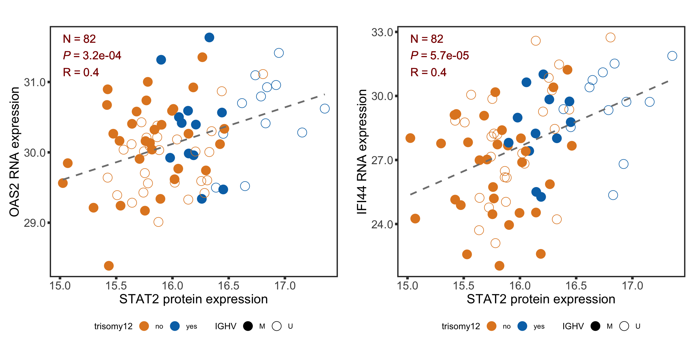 plotCorScatter(plotTab, annoPos = "left", x_lab = "STAT2 protein expression", y_lab = sprintf("%s RNA expression", n))