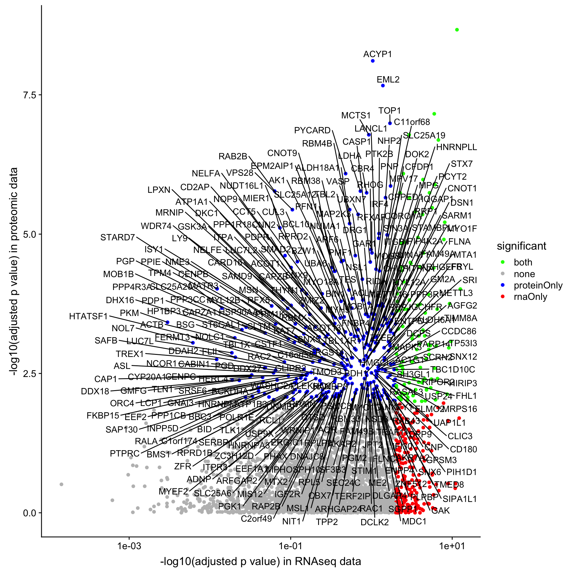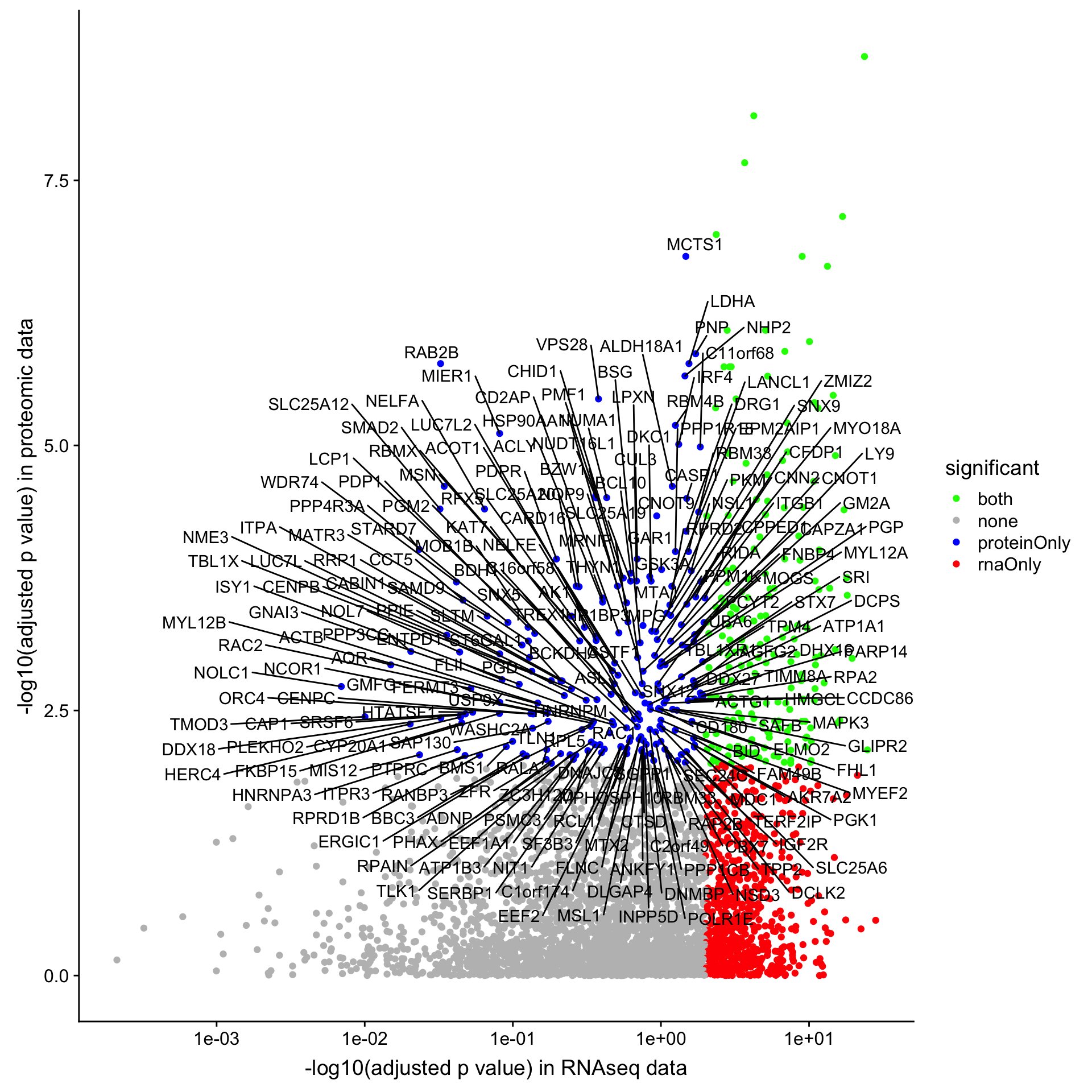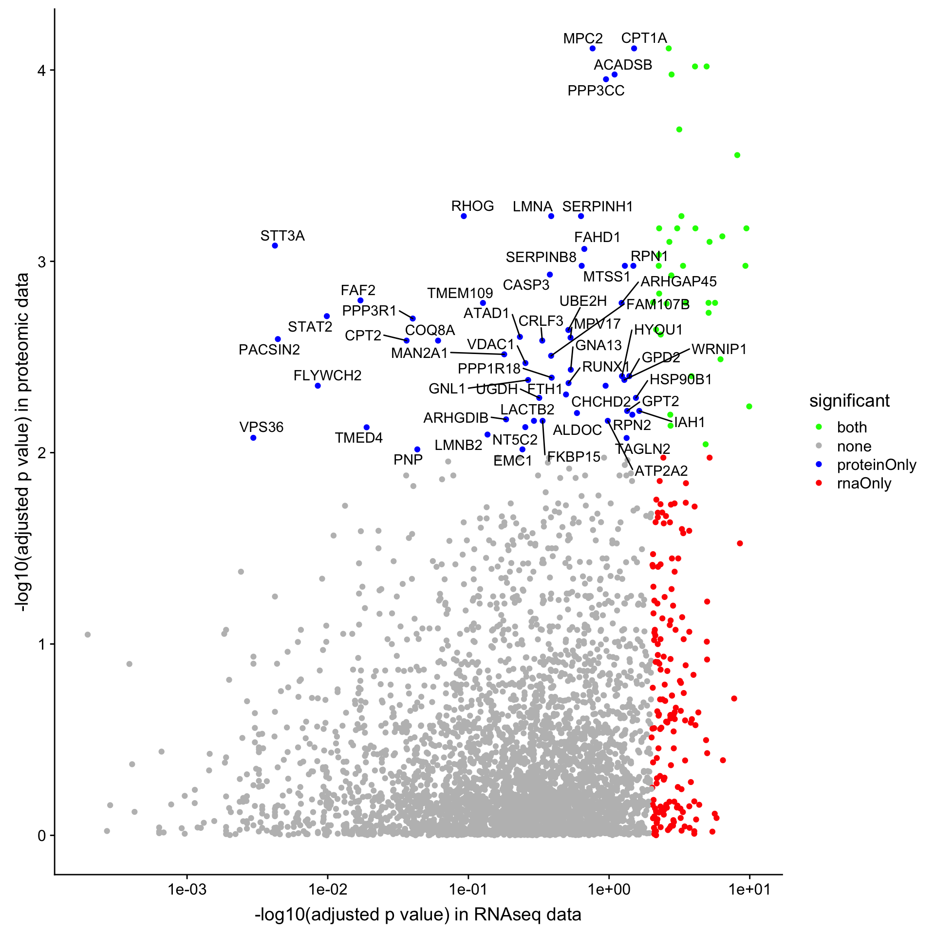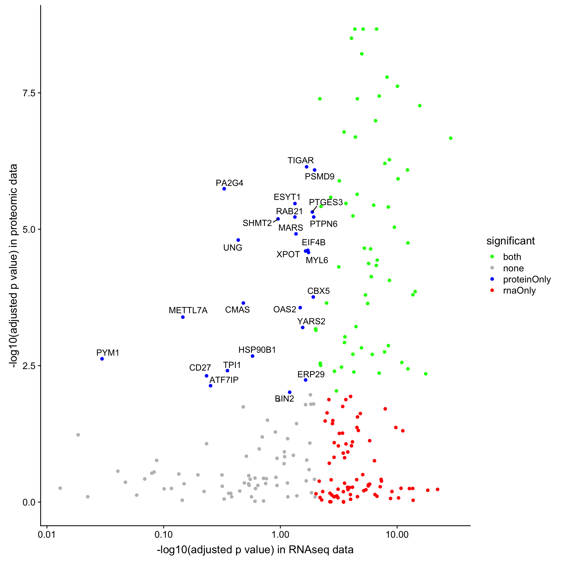 Note that the xaxis is shown is log10 scale, to concentrate more on the differentially expressed proteins, as there are way more differentially expressed genes by RNAseq than proteins.