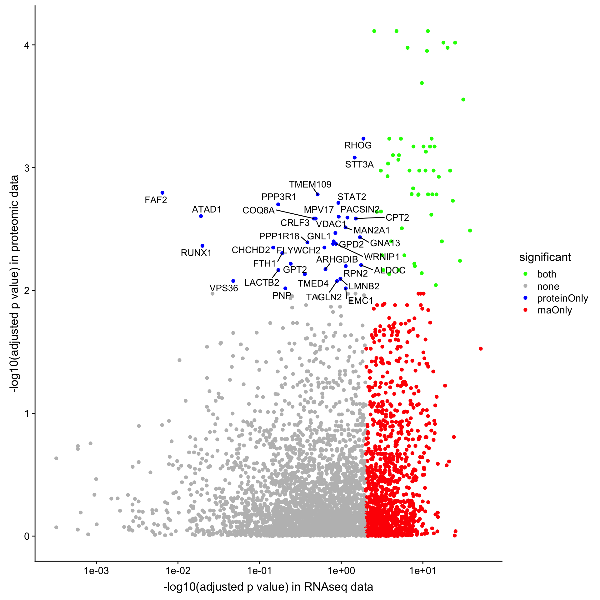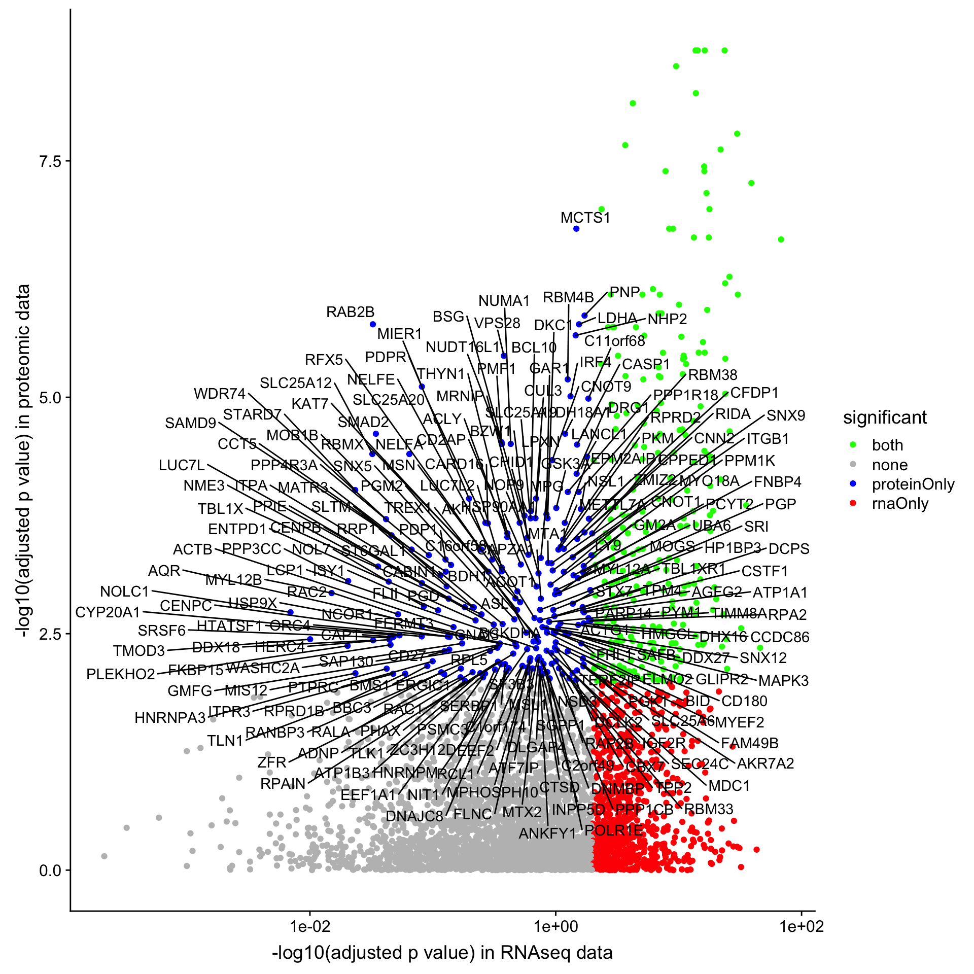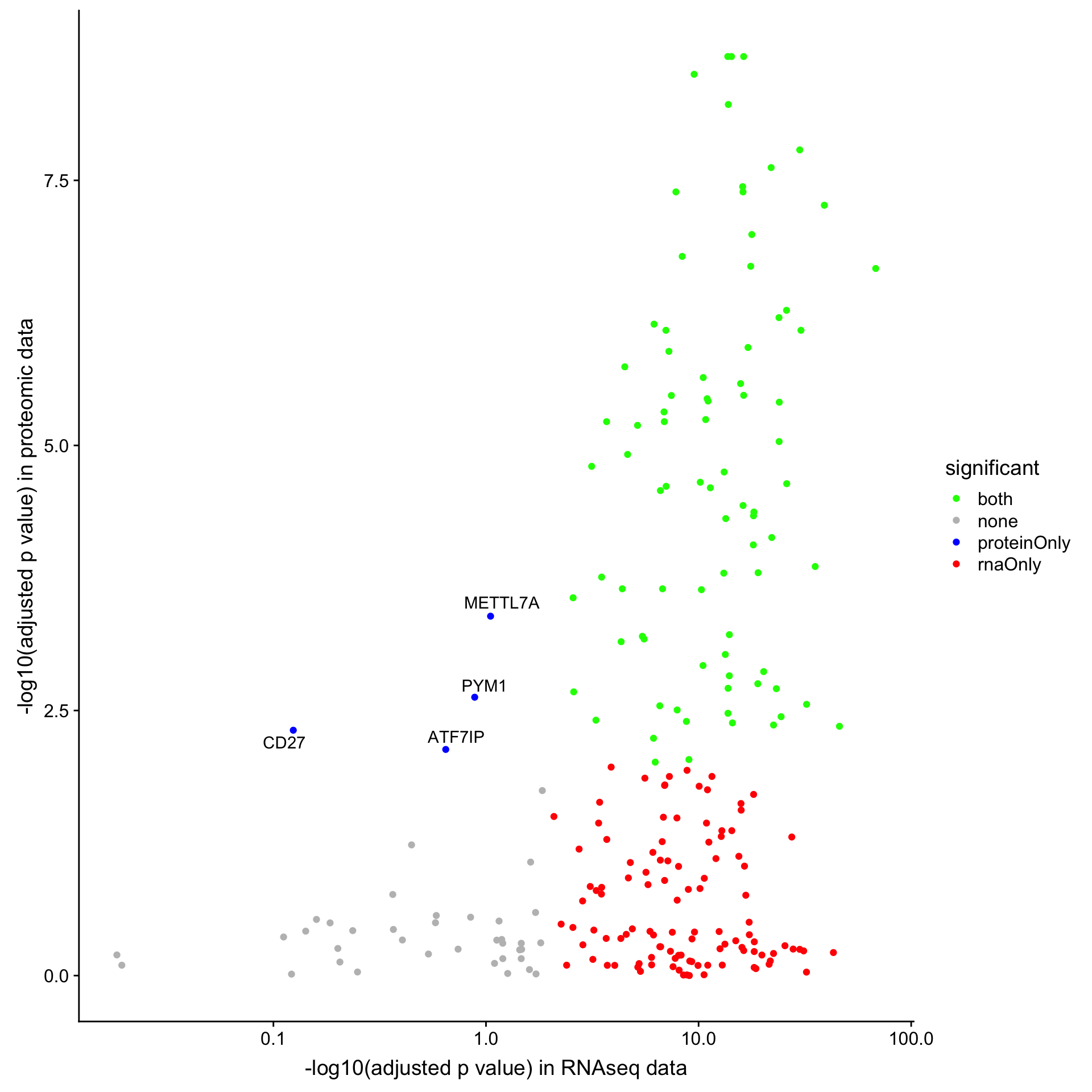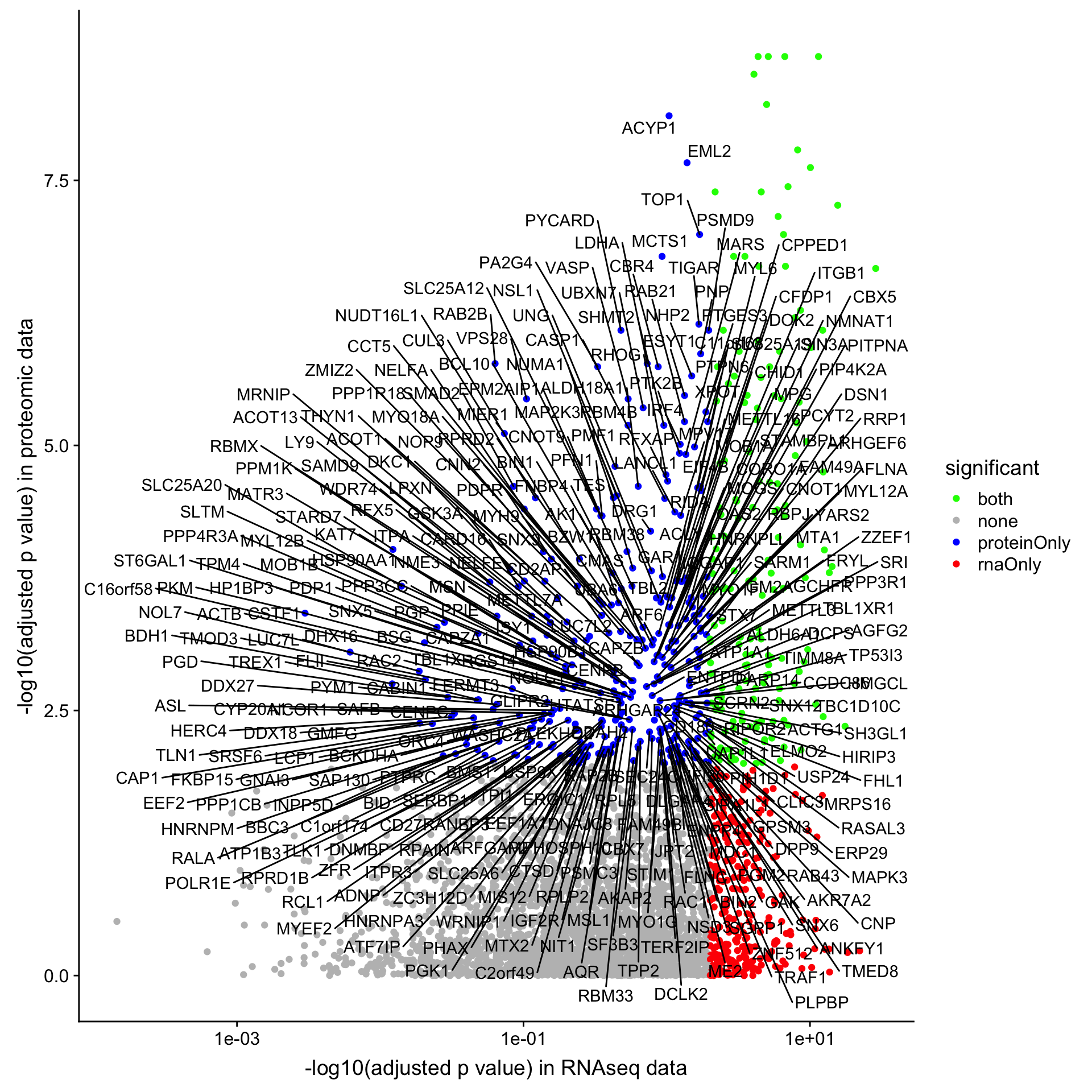 Note that the xaxis is shown is log10 scale, to concentrate more on the differentially expressed proteins, as there are way more differentially expressed genes by RNAseq than proteins.