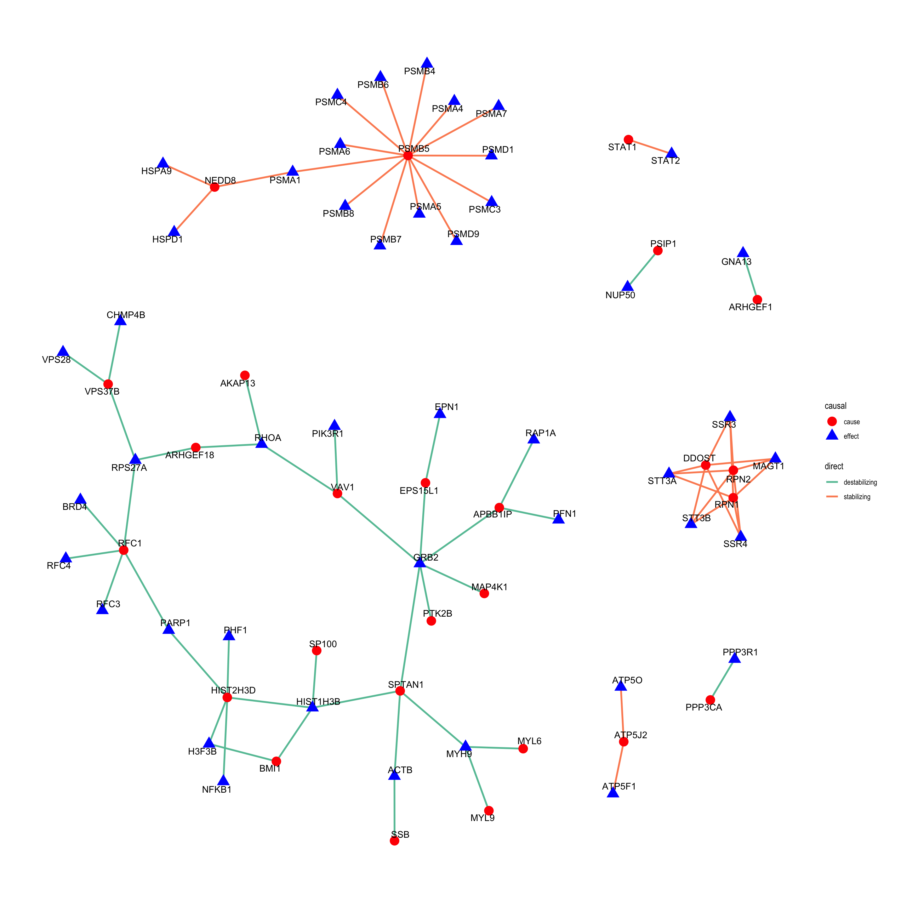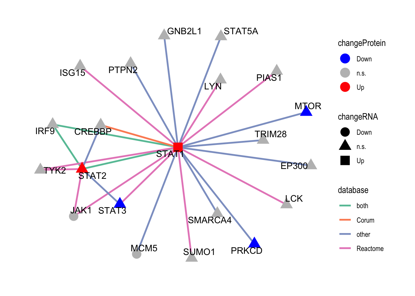 The color scheme here is a little different to the plot above or the trisomy12 network plot, because gene dosage effect is not involved and genes can be up-/down-regulated. In this plot, the color of the nodes indicates expression change at protein level, the shape of the nodes indicates expression change at RNA level.