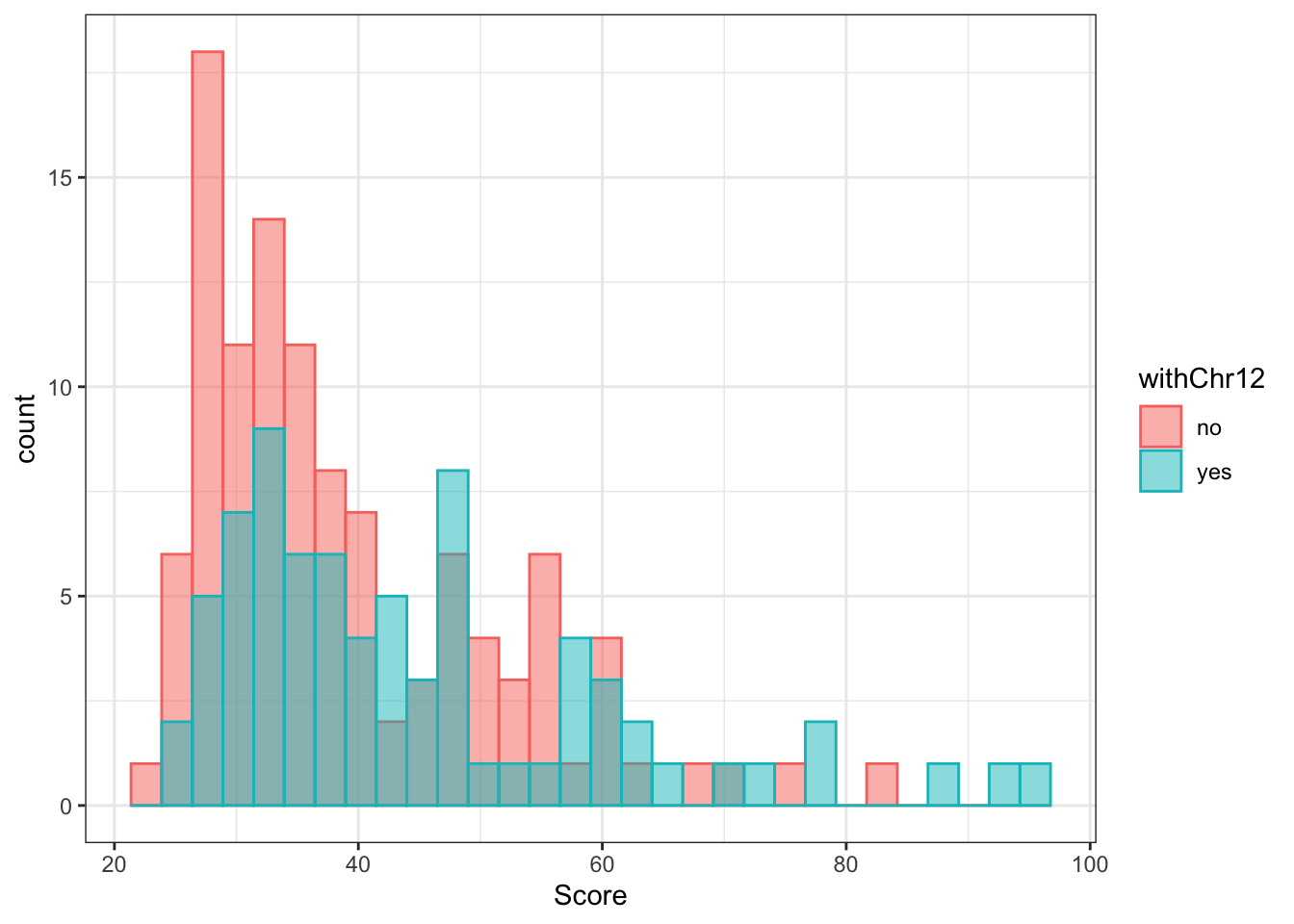 geom_histogram(alpha=0.5, position = "identity", col = NA) + facet_wrap(~withChr12, scale = "free") +
