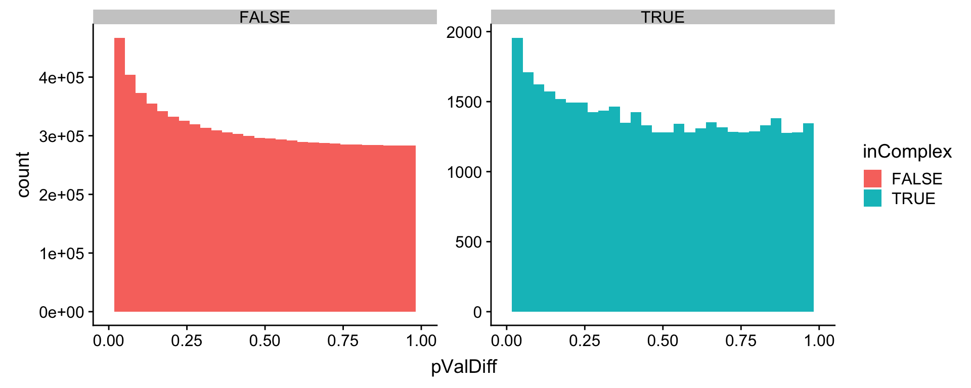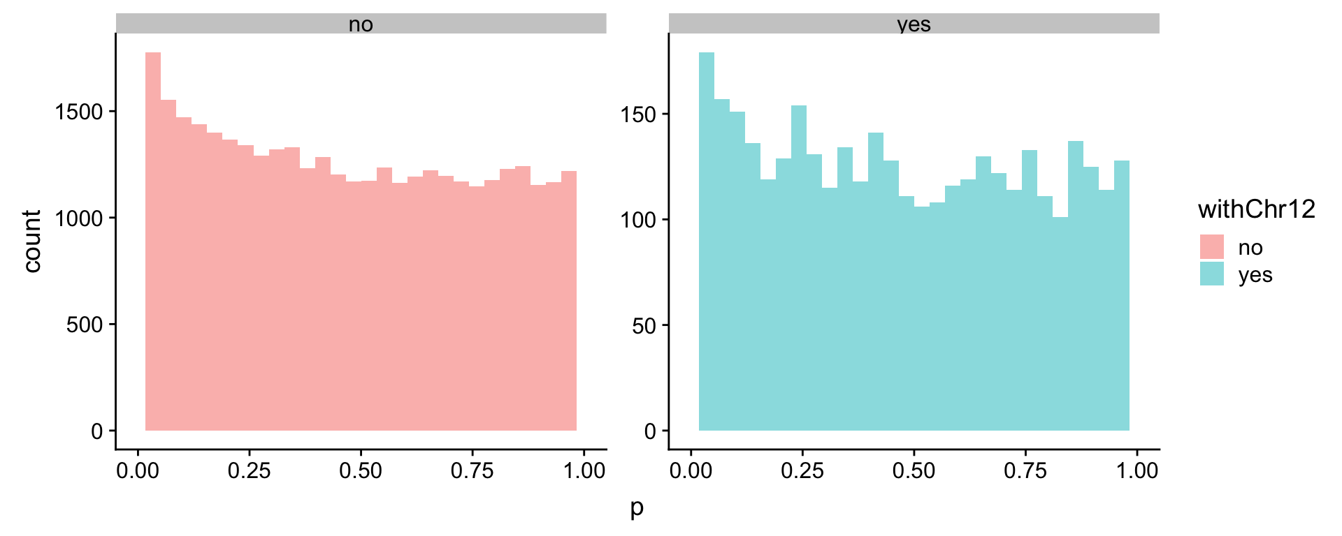 ggplot(comRes.cor, aes(x=p, fill = withChr12, col = withChr12)) +
