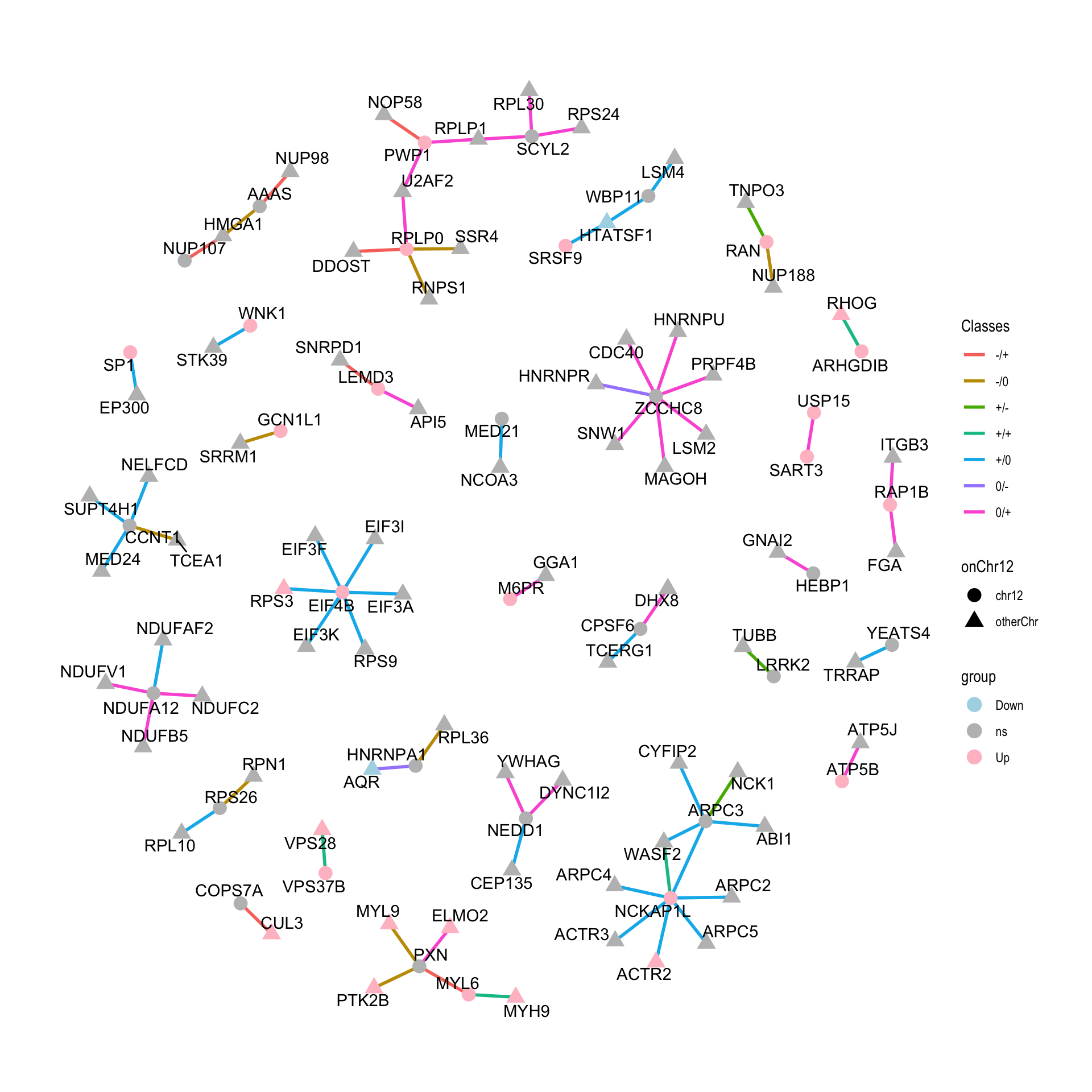 “Classes” is the direction of changes. “+” means positive correlation, “-” means negative correlation, “0” means no correlation. “0/+” means no correlation in WT samples but positive correlation in tri12 samples; “+/0” means positive correlations in WT samples but no correlation in trisomy12 samples. Any types of correlation changes may suggest a change of complex formation behavior.