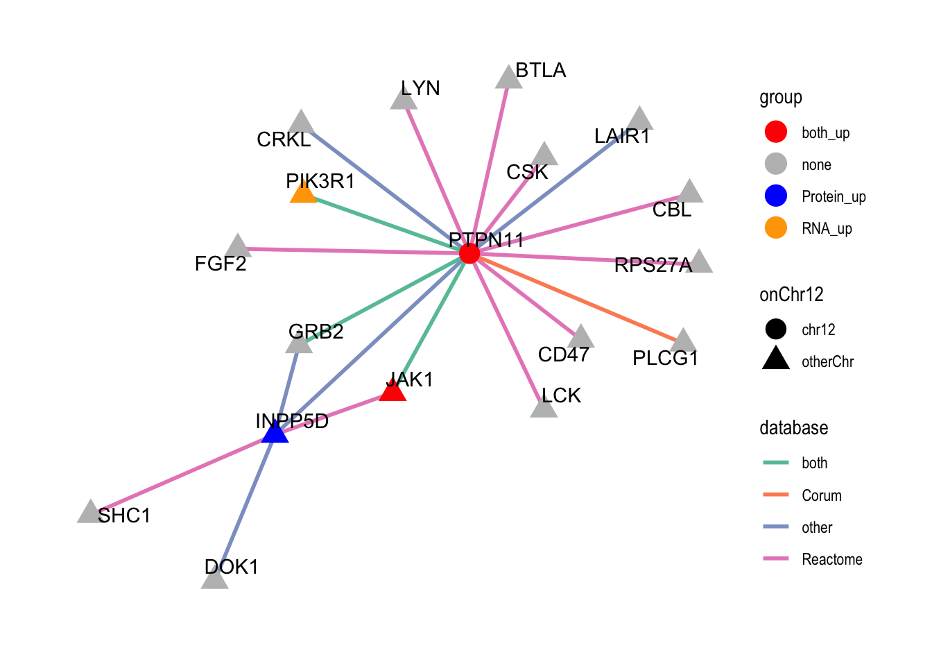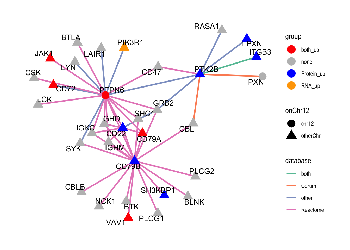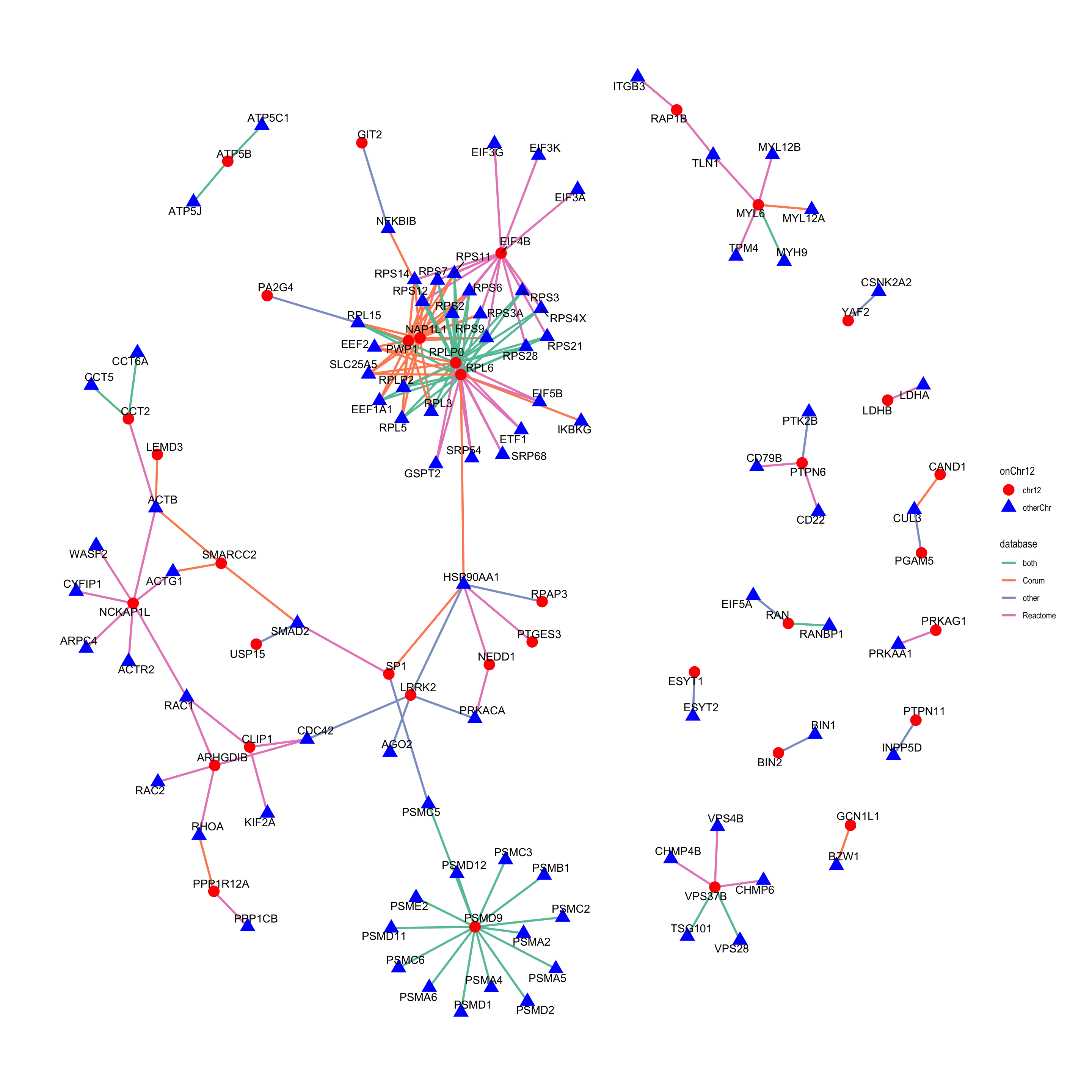 In this plot, the proteins on chr12 are shown as red circles and non-chr12 proteins are blue triangles. The color of the edges indicate the databases that the complexes based upon. I consider “both” (annotated both in Corum and Reactome) as the stronger evidence, while “other” (not annotated in either Corum or Reactome database but some other databases) as weaker evidence. But this is very subjective.