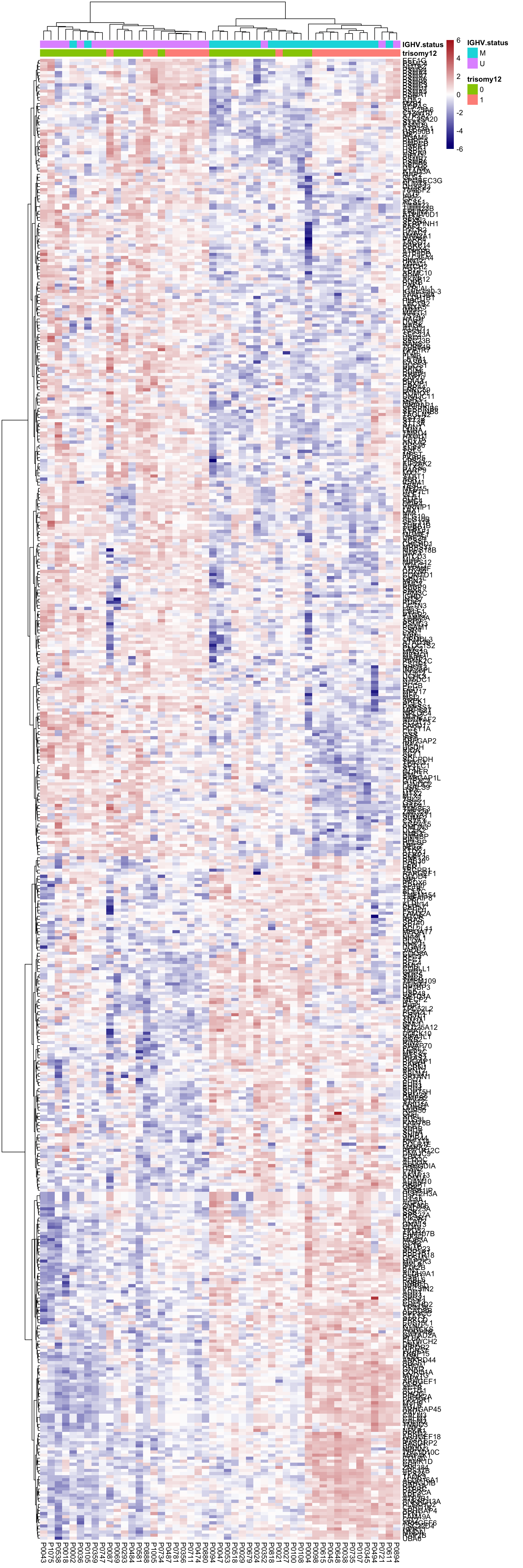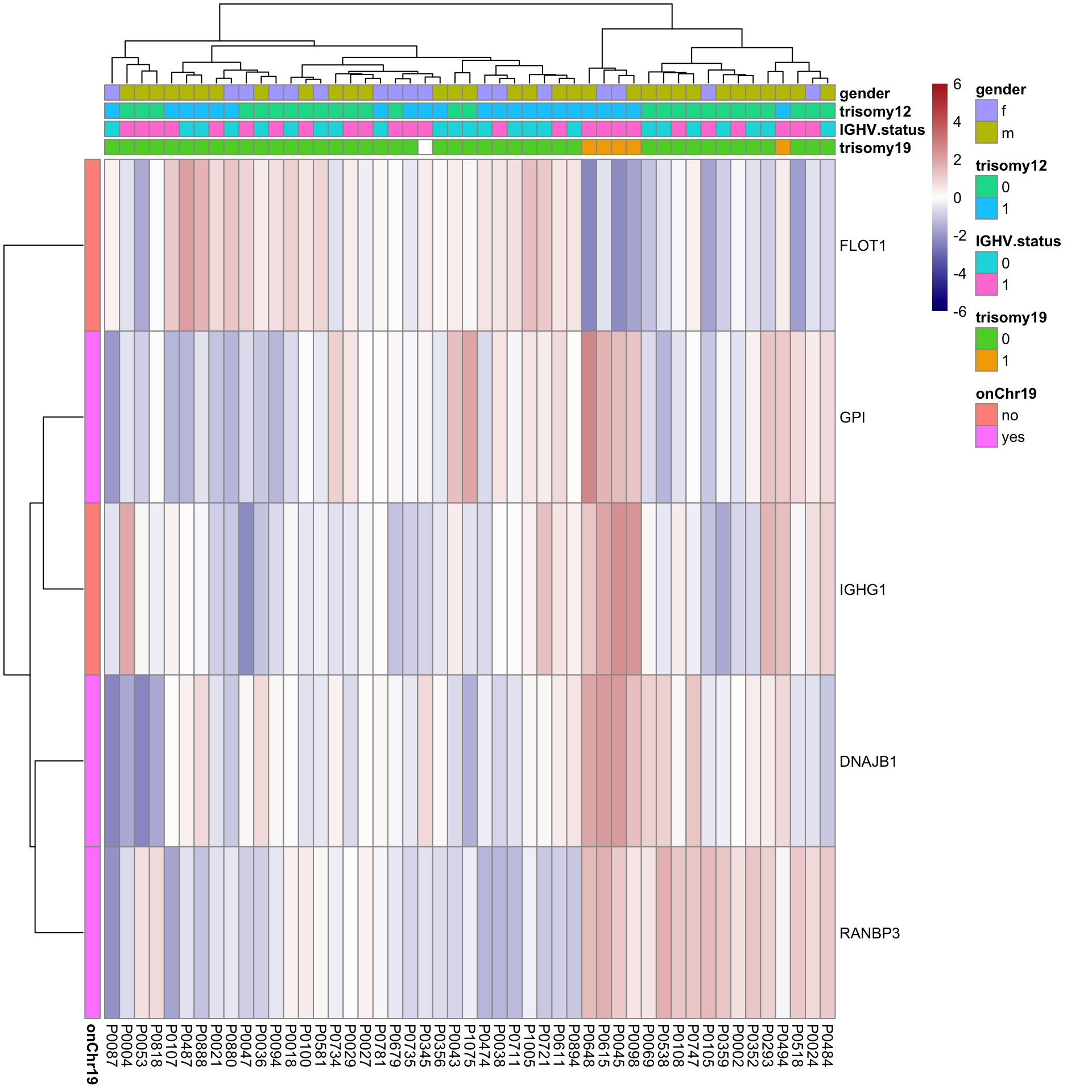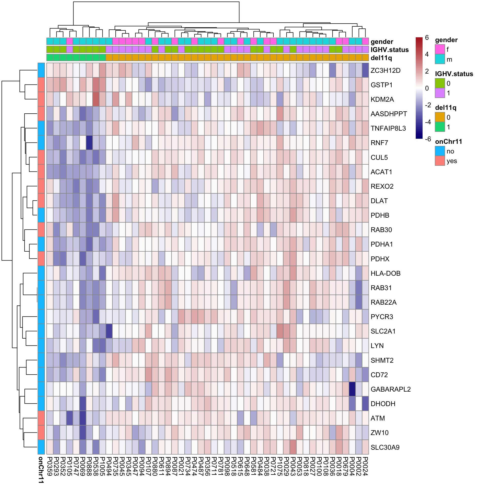 rowAnno <- rowData(protCLL)[proList, c("chromosome_name","hgnc_symbol"),drop=FALSE] %>% data.frame(stringsAsFactors = FALSE) %>%