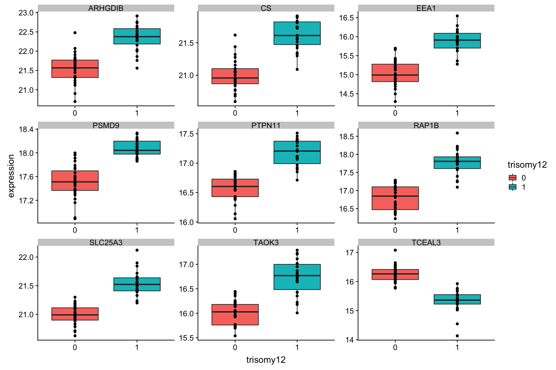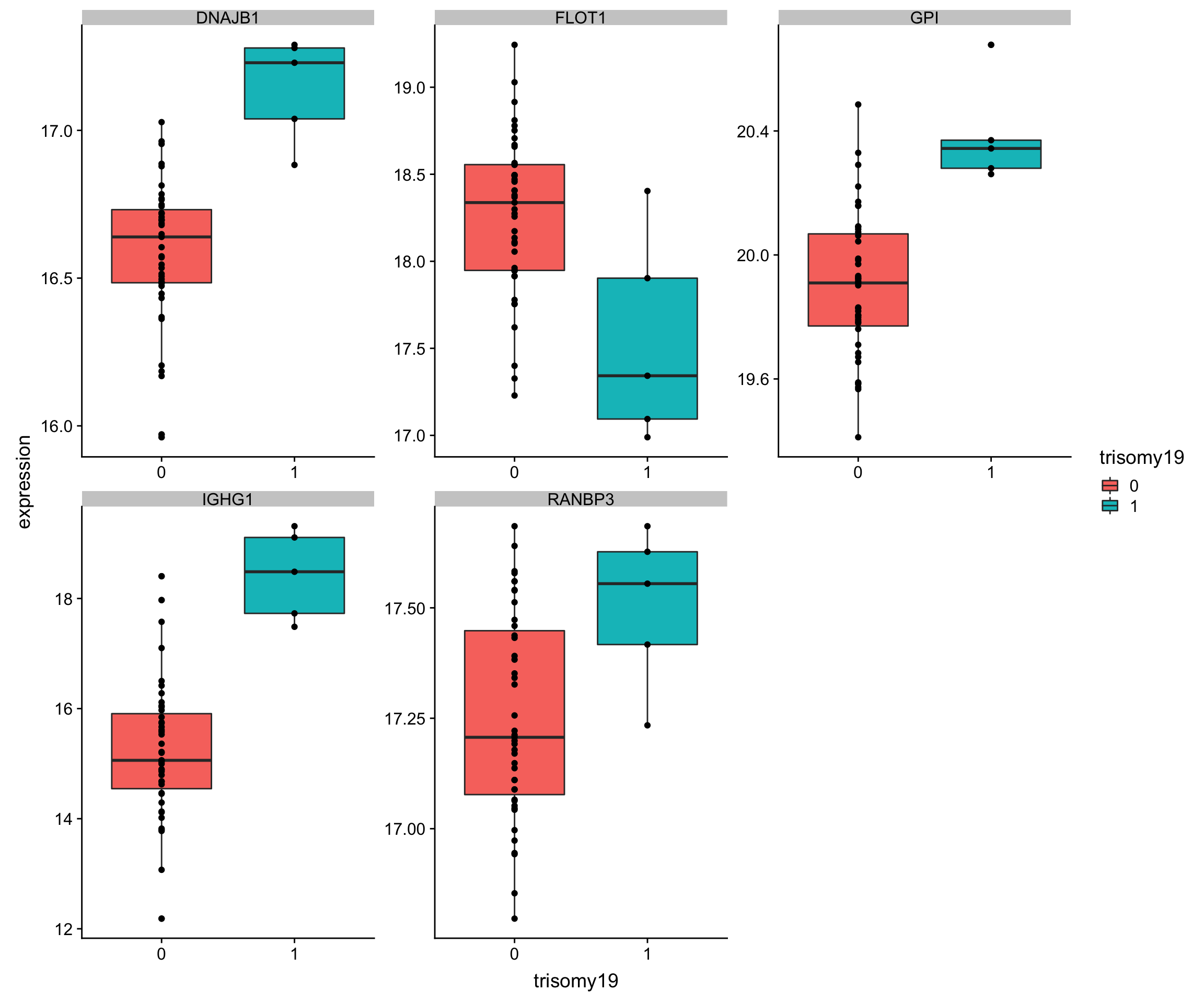 ggplot(plotTab, aes(x=trisomy19, y = expression)) + geom_boxplot(aes(fill = trisomy19)) + geom_point() +