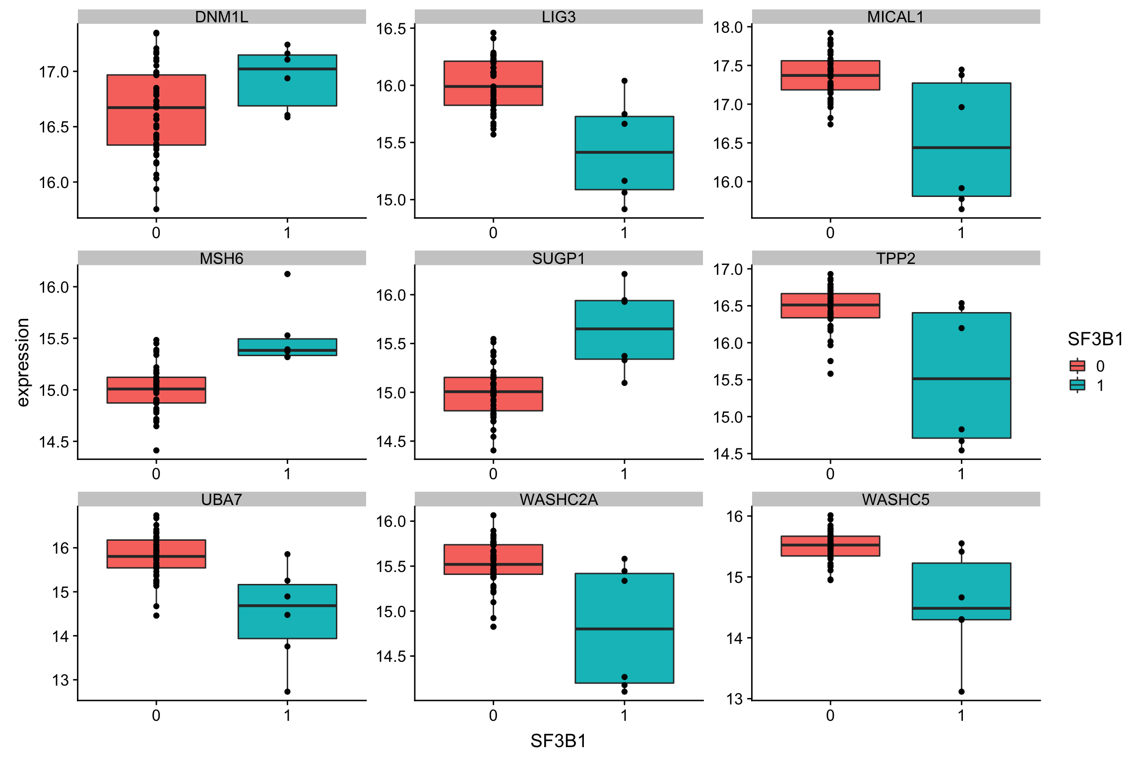 ggplot(plotTab, aes(x=SF3B1, y = expression)) + geom_boxplot(aes(fill = SF3B1)) + geom_point() +