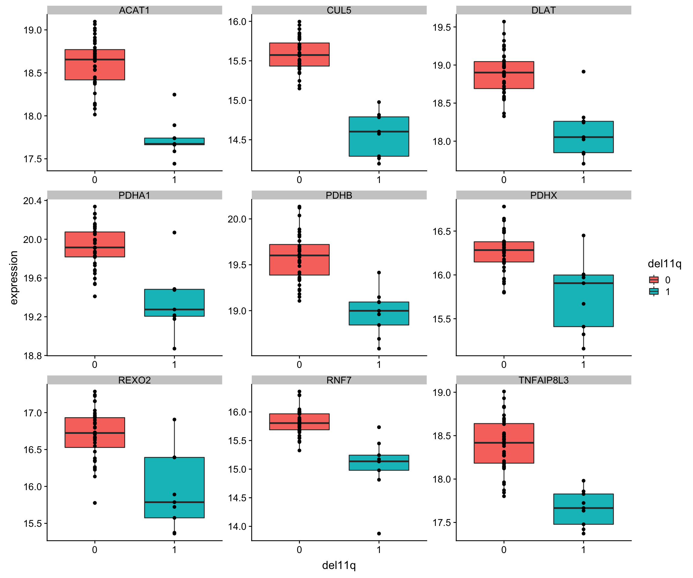 ggplot(plotTab, aes(x=del11q, y = expression)) + geom_boxplot(aes(fill = del11q)) + geom_point() +