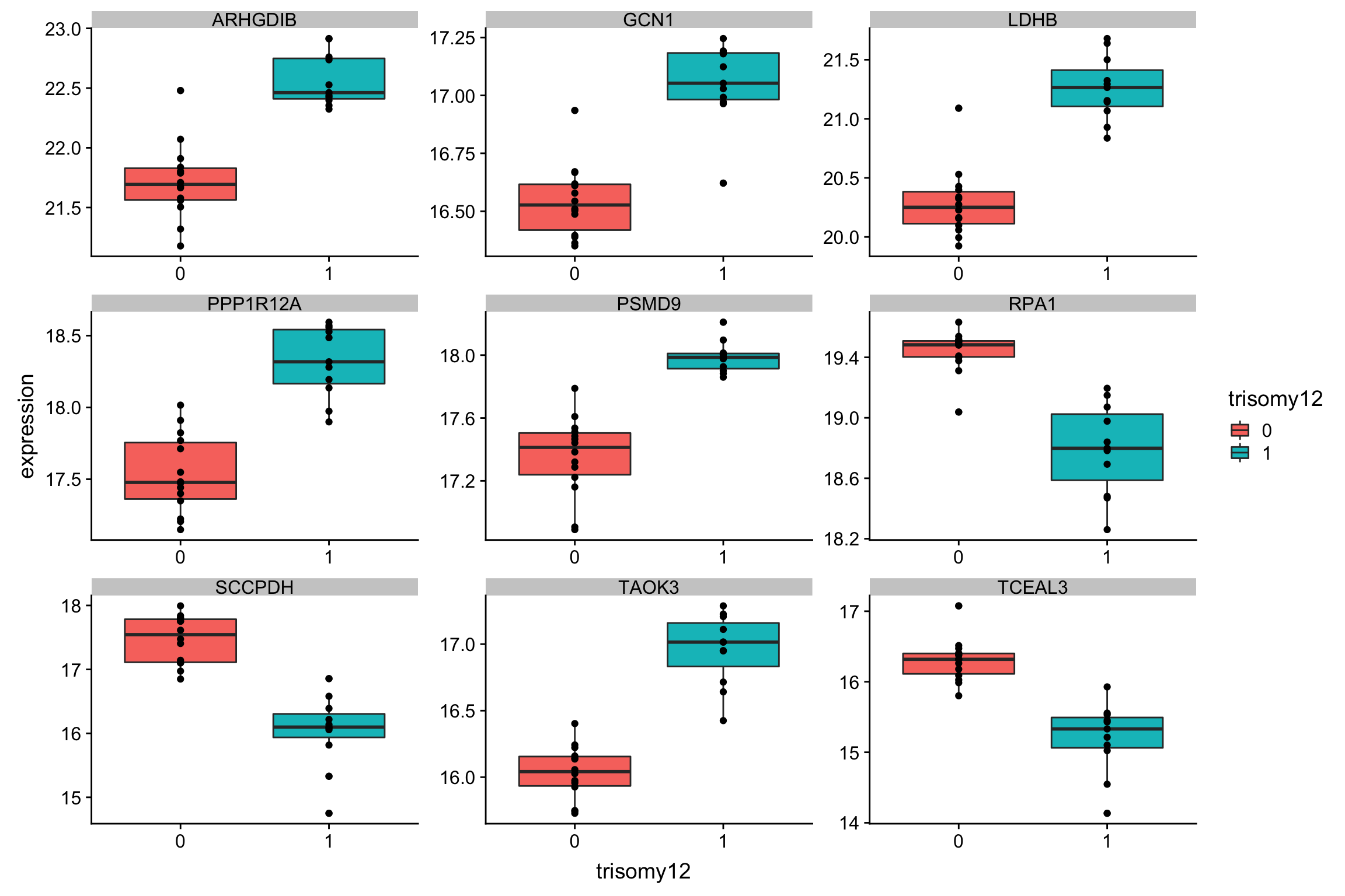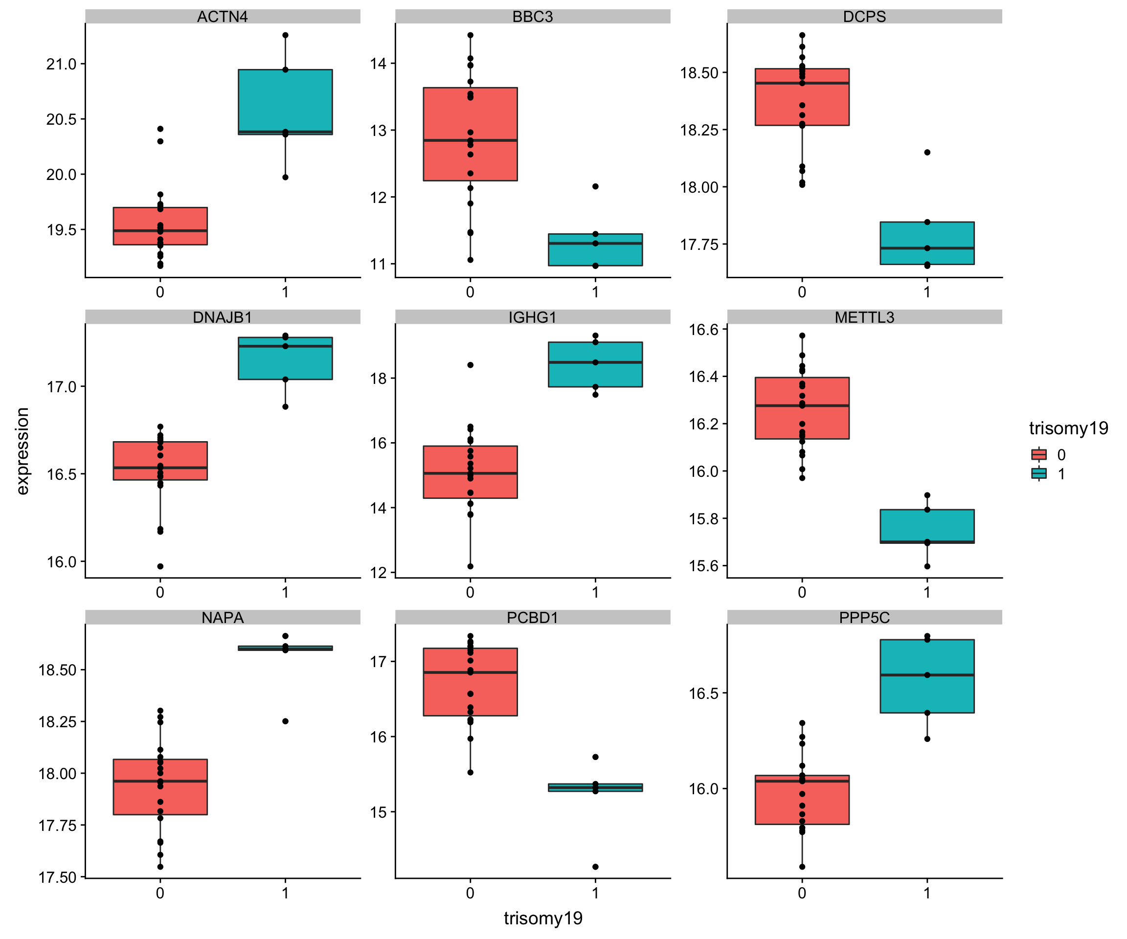 ggplot(plotTab, aes(x=trisomy19, y = expression)) + geom_boxplot(aes(fill = trisomy19)) + geom_point() +