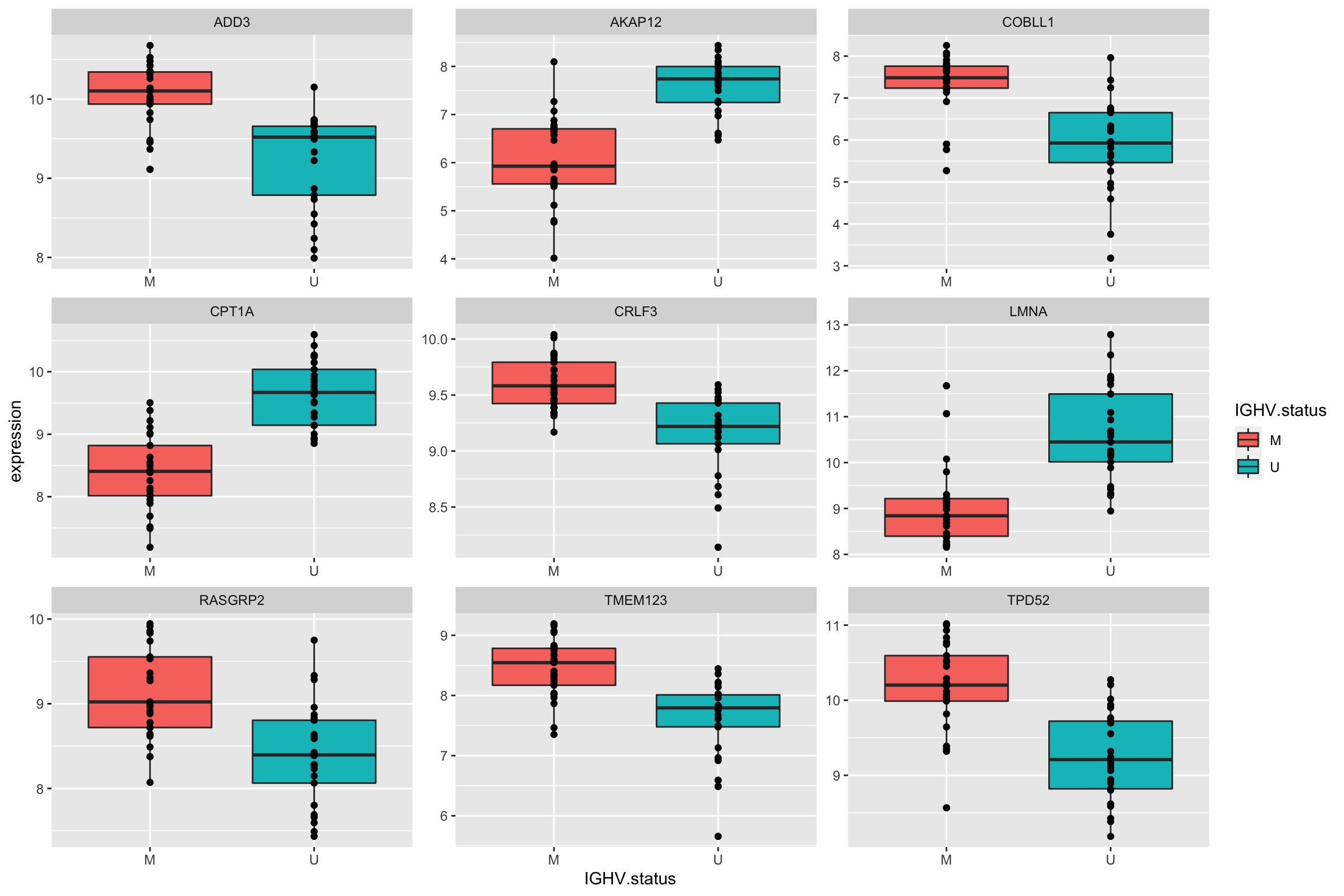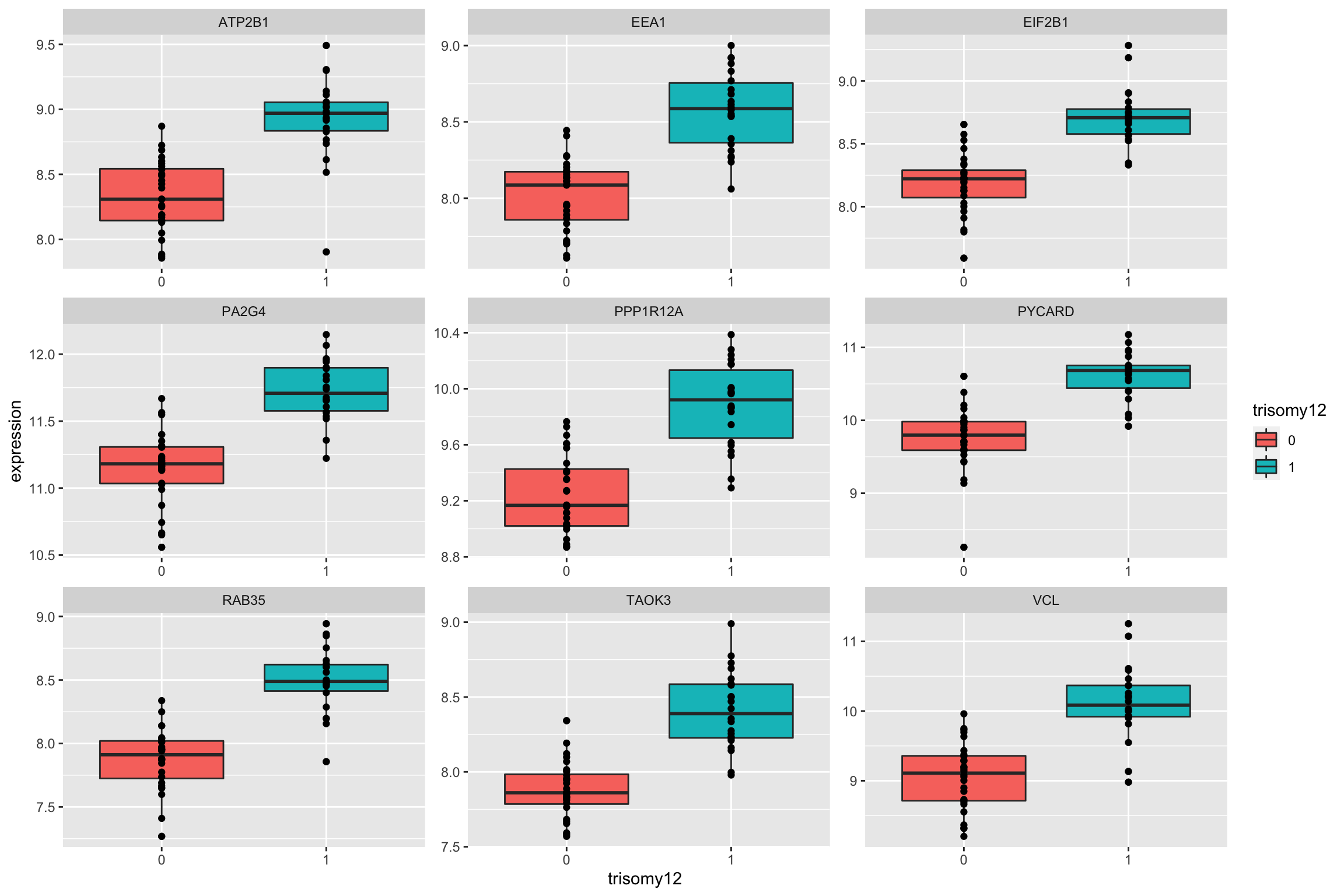 ggplot(plotTab, aes(x=trisomy19, y = expression)) + geom_boxplot(aes(fill = trisomy19)) + geom_point() +