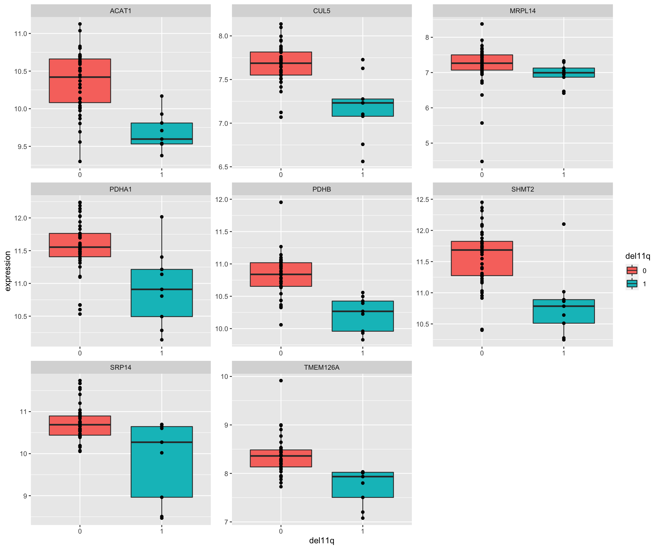 ggplot(plotTab, aes(x=del11q, y = expression)) + geom_boxplot(aes(fill = del11q)) + geom_point() +