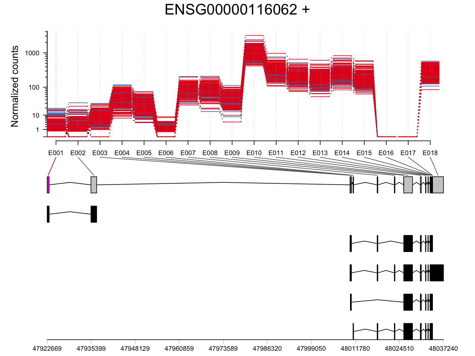 plotDEXSeq(resDxd2, "ENSG00000116062", displayTranscripts = TRUE, legend = FALSE, norCounts = TRUE, expression = FALSE)