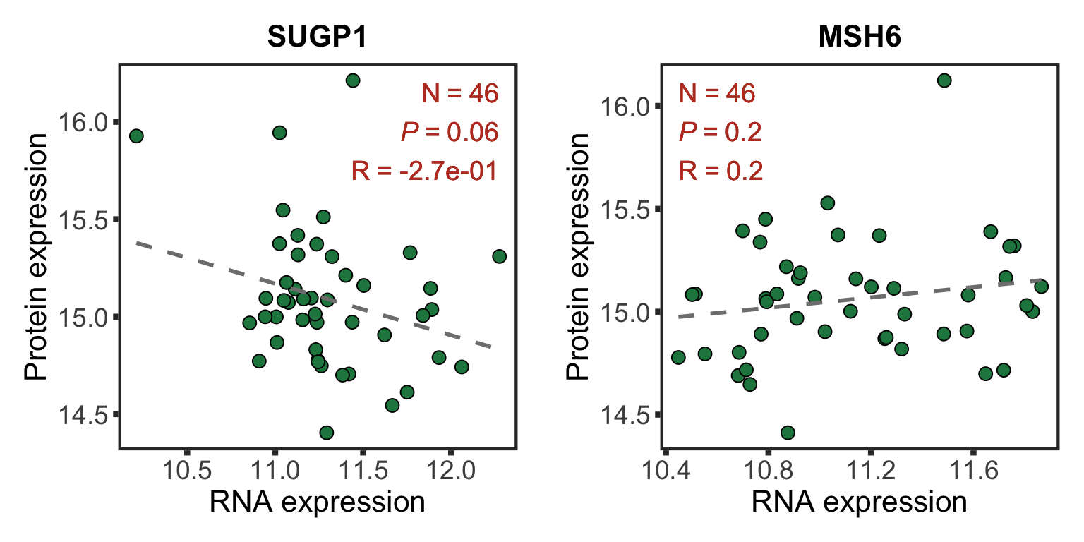 plotCorScatter(plotTab, "x","y", showR2 = FALSE, annoPos = annoPos, x_lab = "RNA expression",