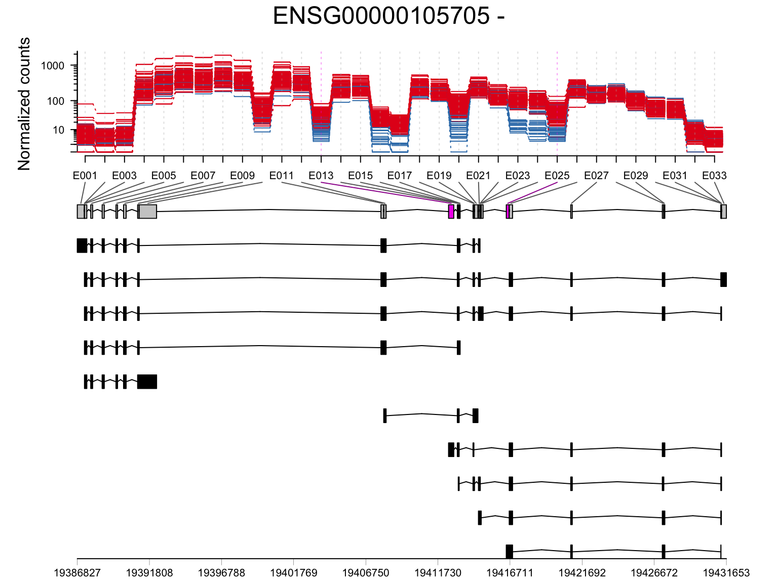 plotDEXSeq(resDxd2, "ENSG00000105705", displayTranscripts = TRUE, legend = FALSE, norCounts = TRUE, expression = FALSE)