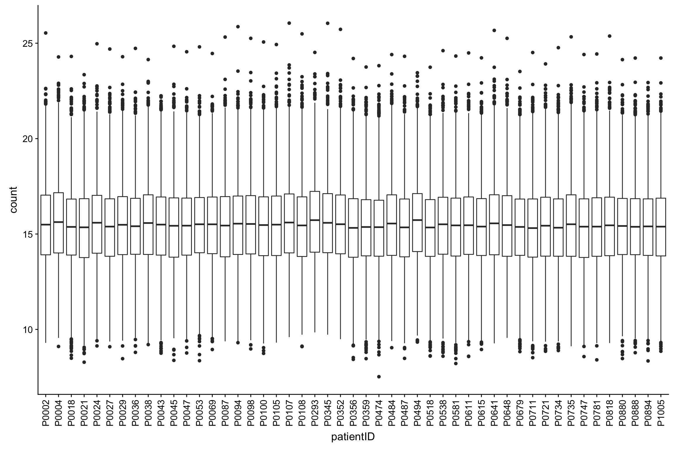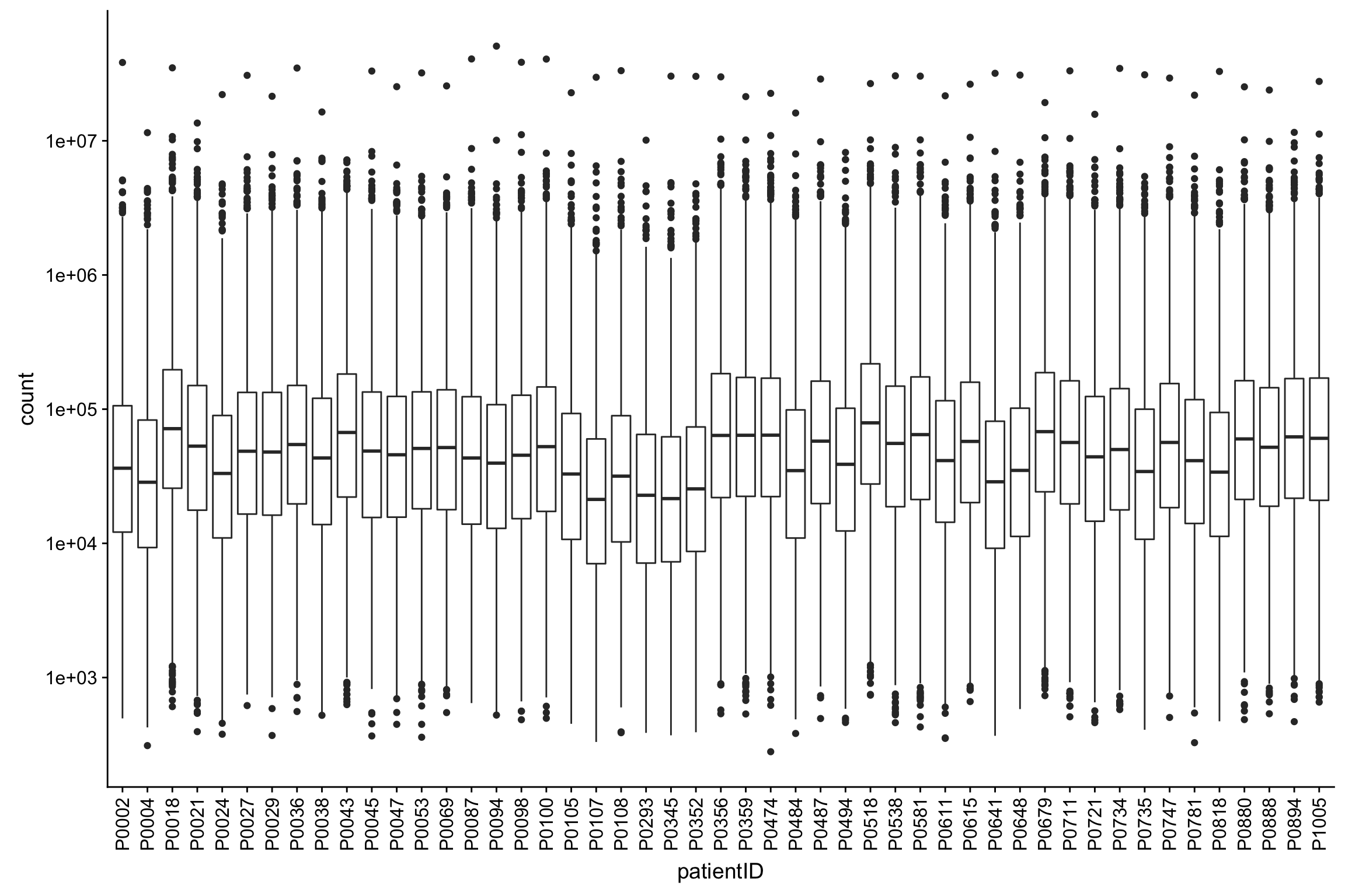 ggplot(protTab, aes(x=patientID, y=count)) + geom_boxplot() +