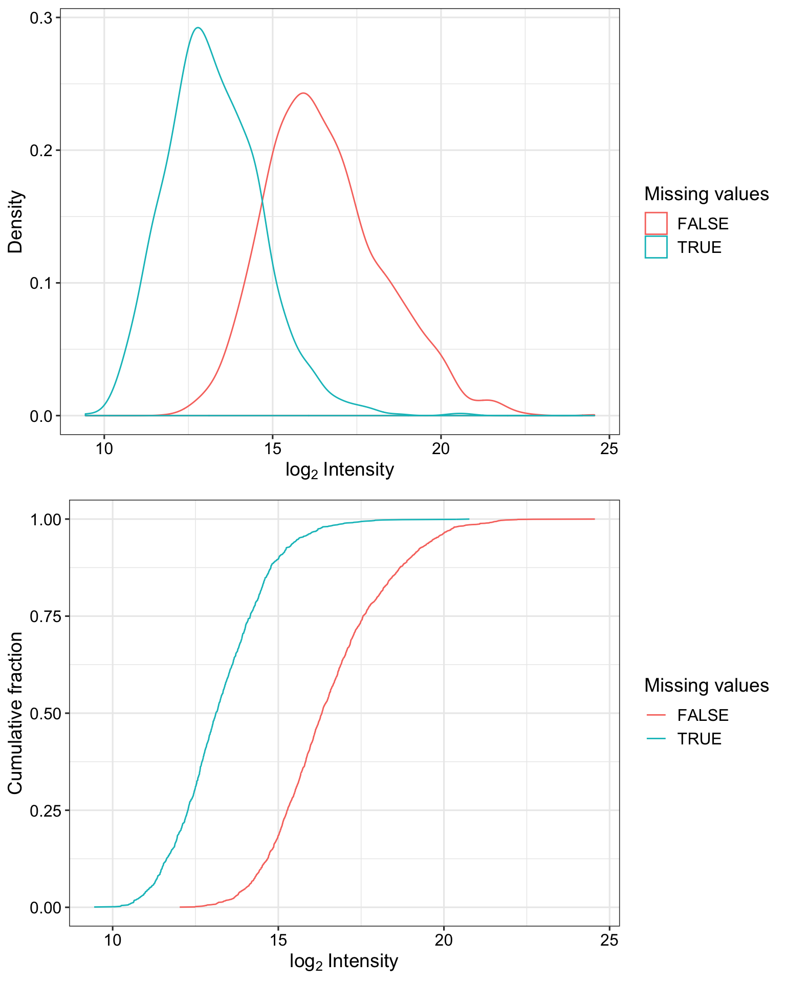 Proteins with missing values have on average low intensities. Not missing at random.