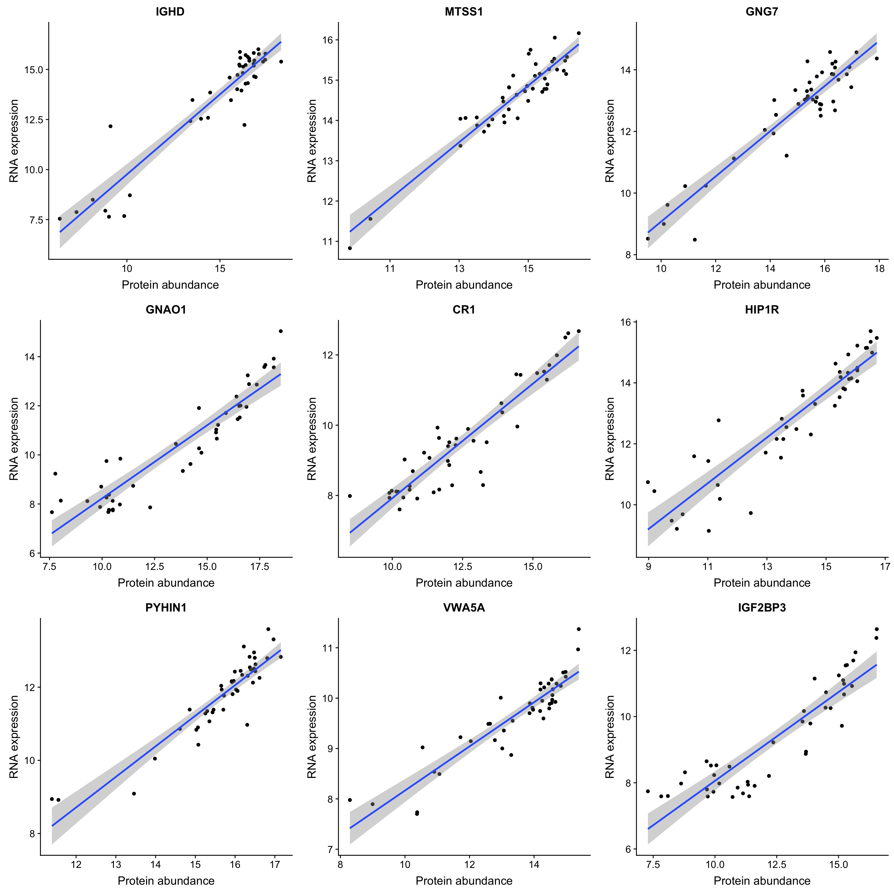 Calculate correlations between protein abundance and RNA expression