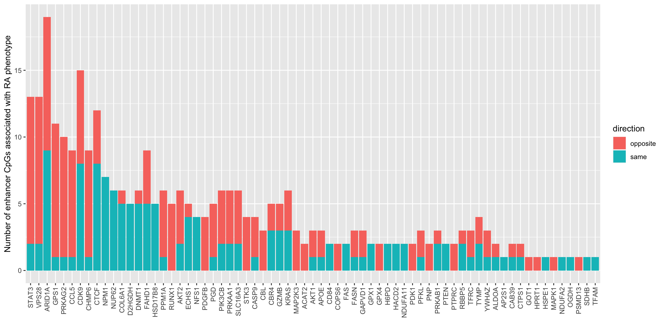 Note that only the proteins whose enhancer CpGs are also correlated with RA are considered in the correlation test with metabolites