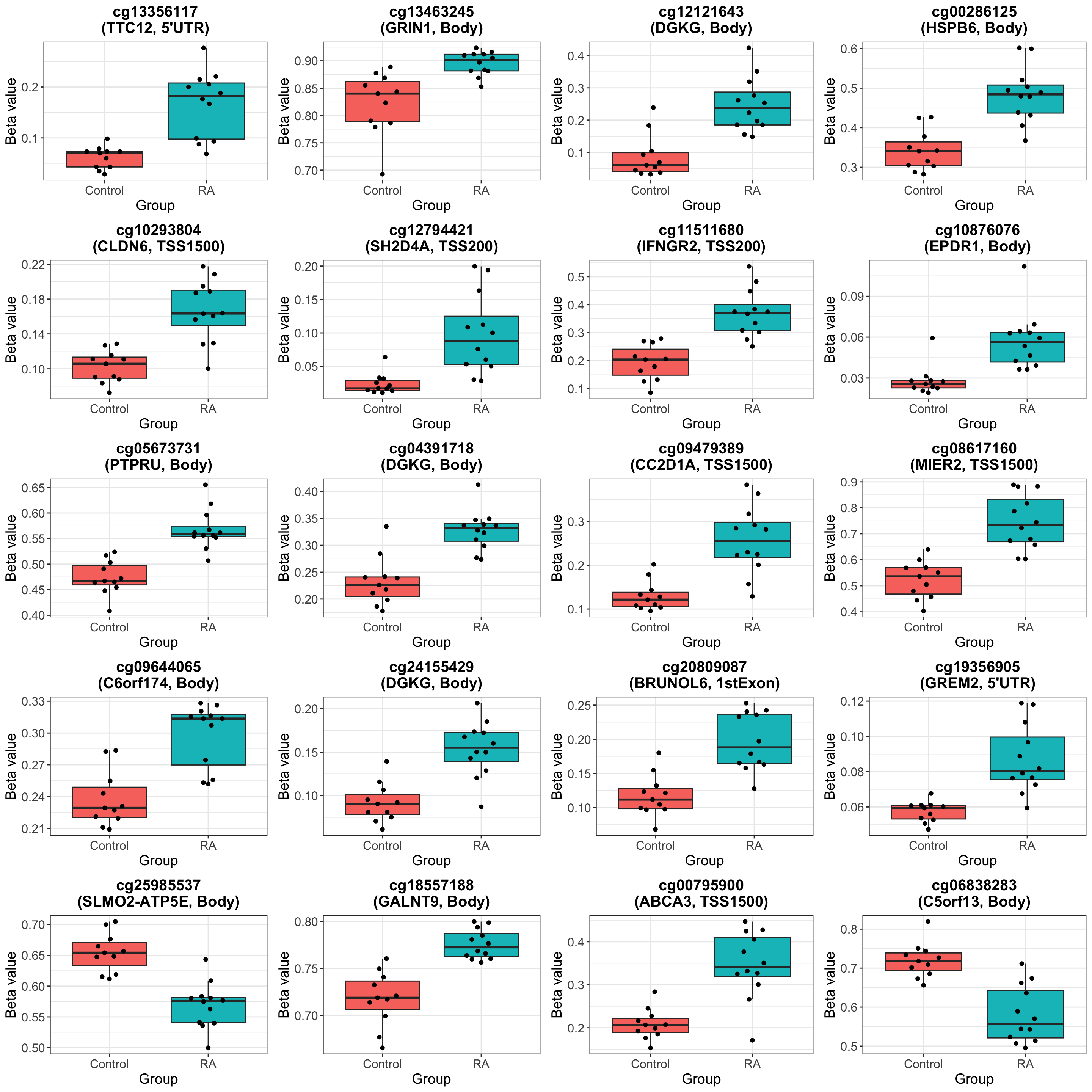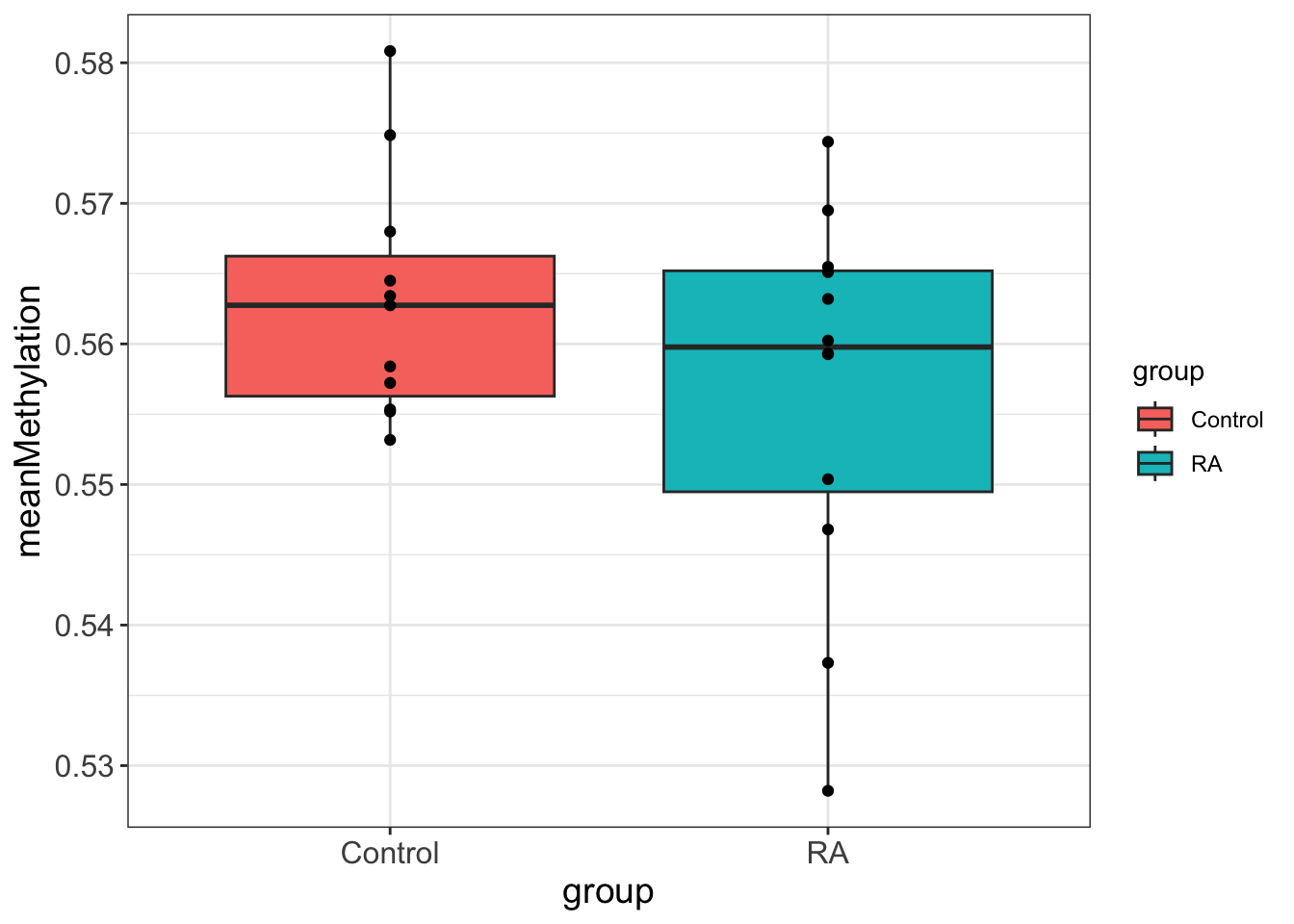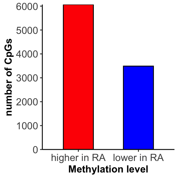 On the overall methylation level, there’s no strong trend that RA samples have higher methylation.