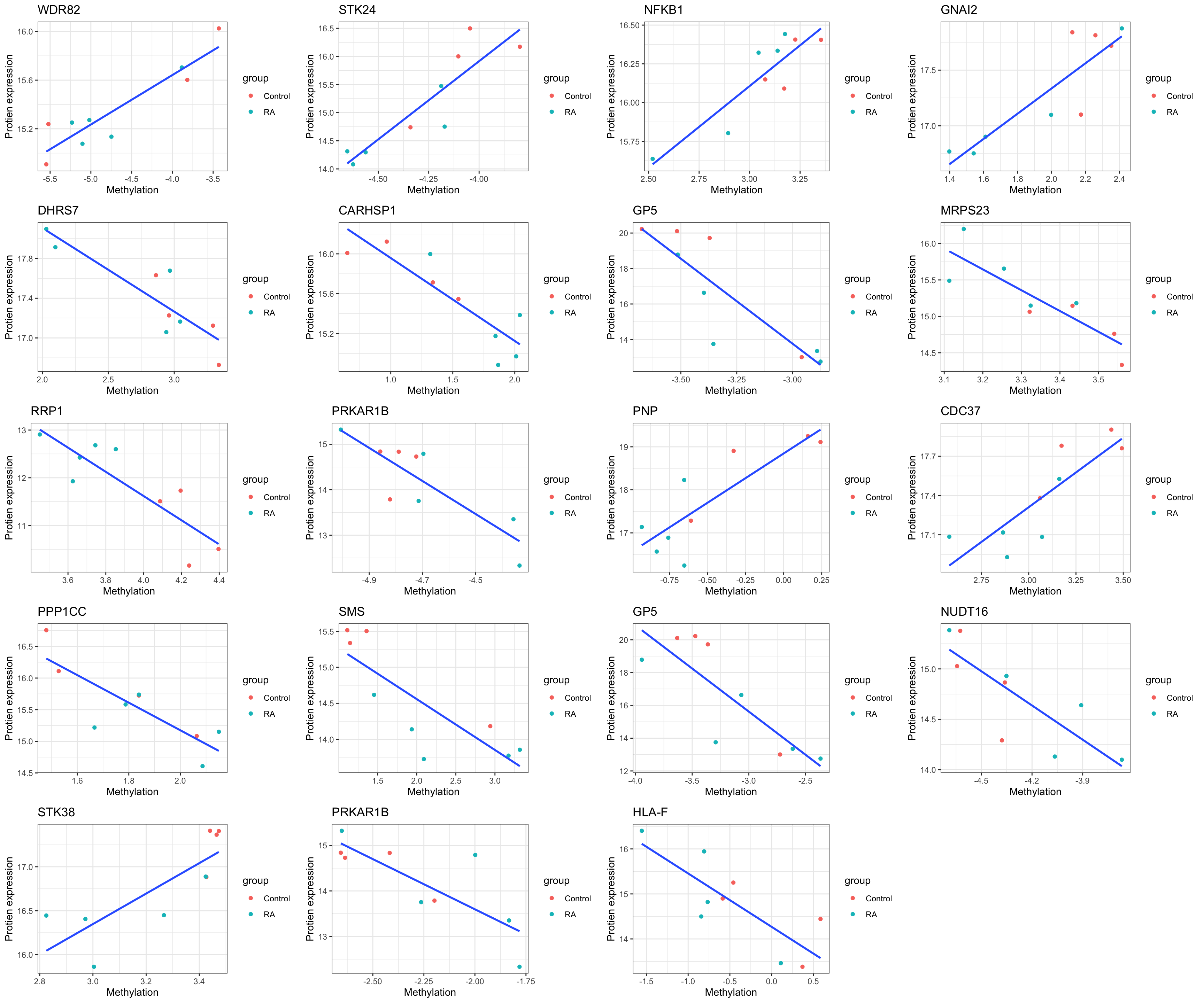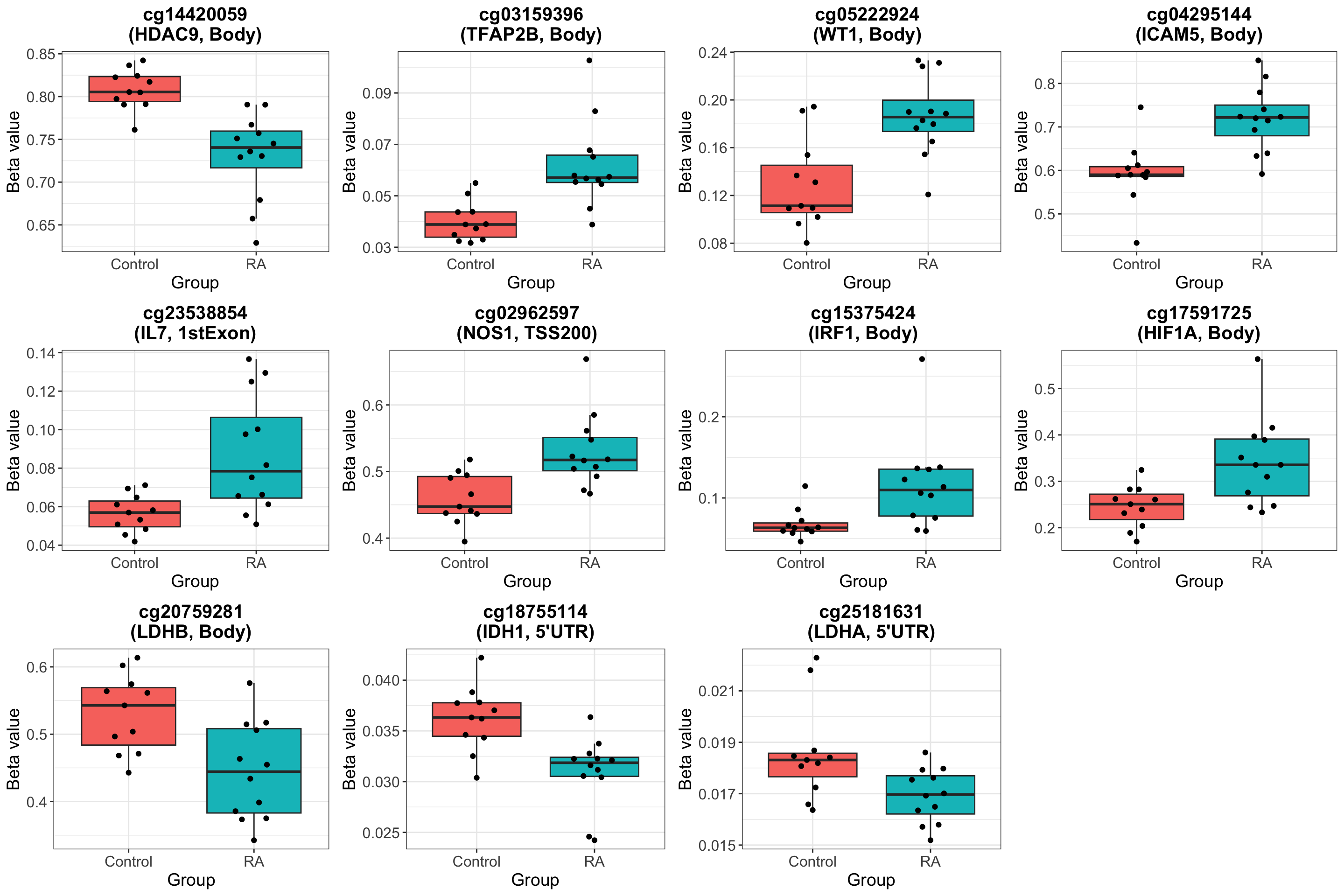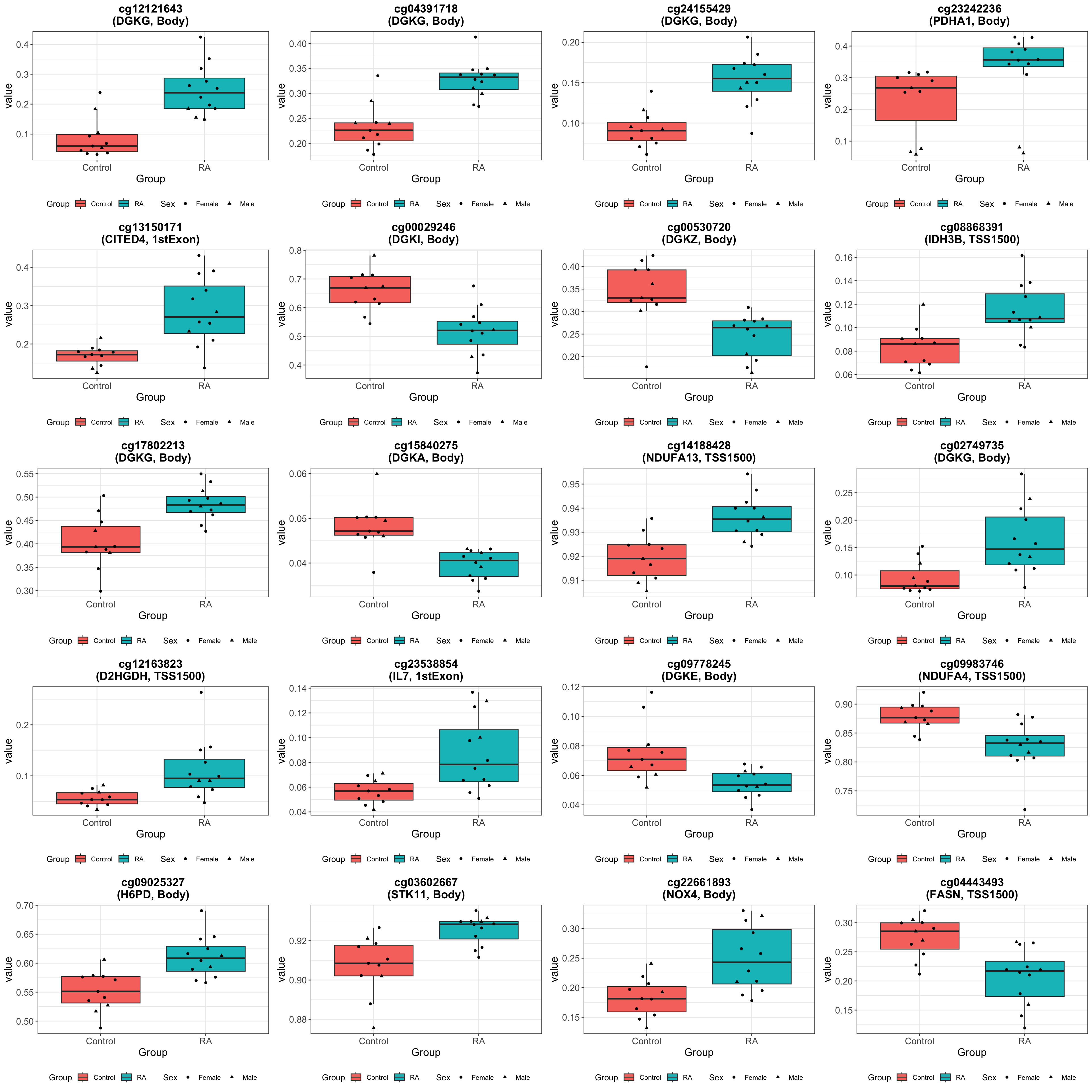 On the overall methylation level, there’s no strong trend that RA samples have higher methylation.