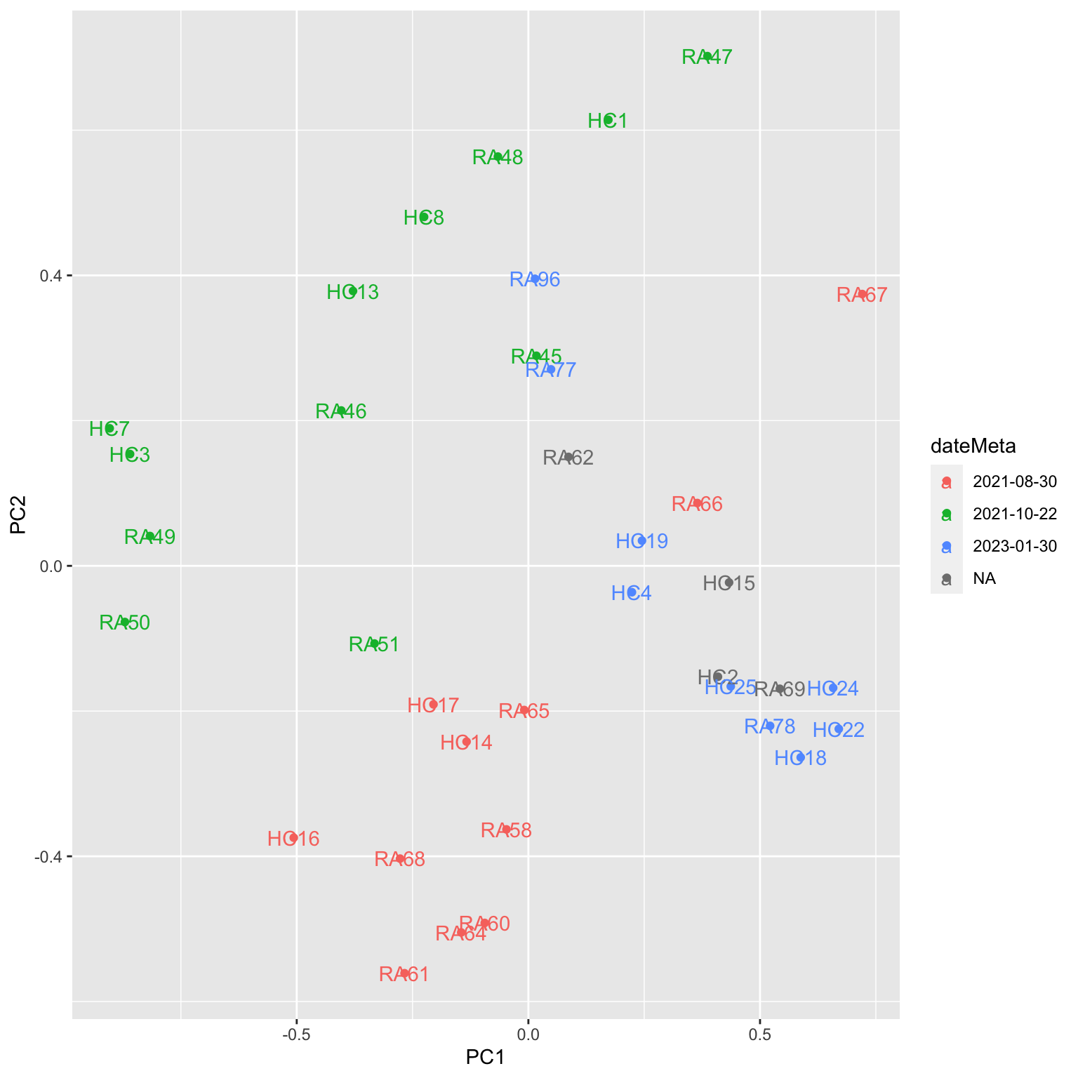 ggplot(plotTab, aes(x=PC1, y=PC2, col = dateMeta, label = sampleID)) +