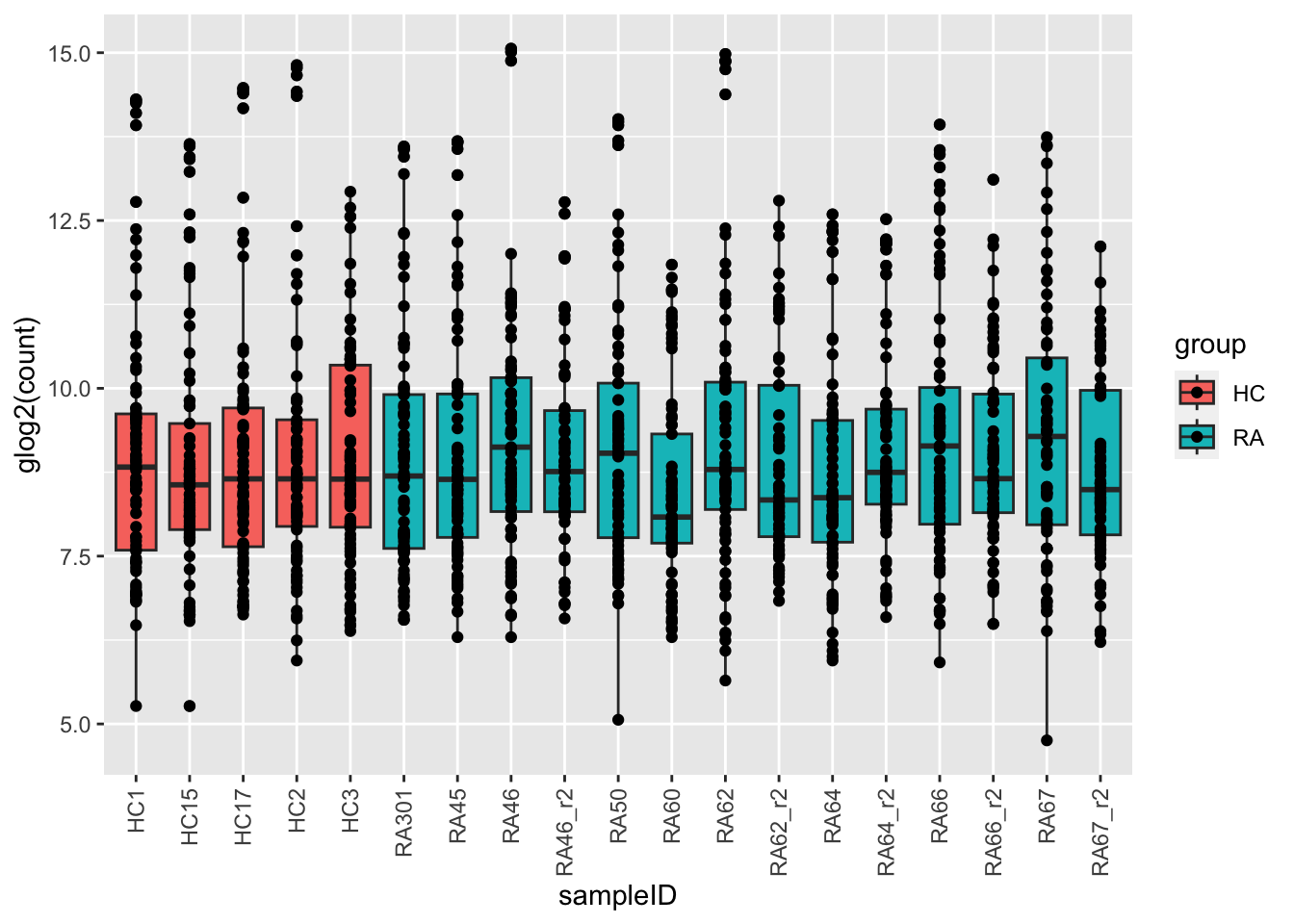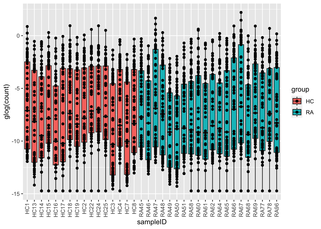 ggplot(plotTab, aes(x=sampleID, y=glog(count), fill = group)) +