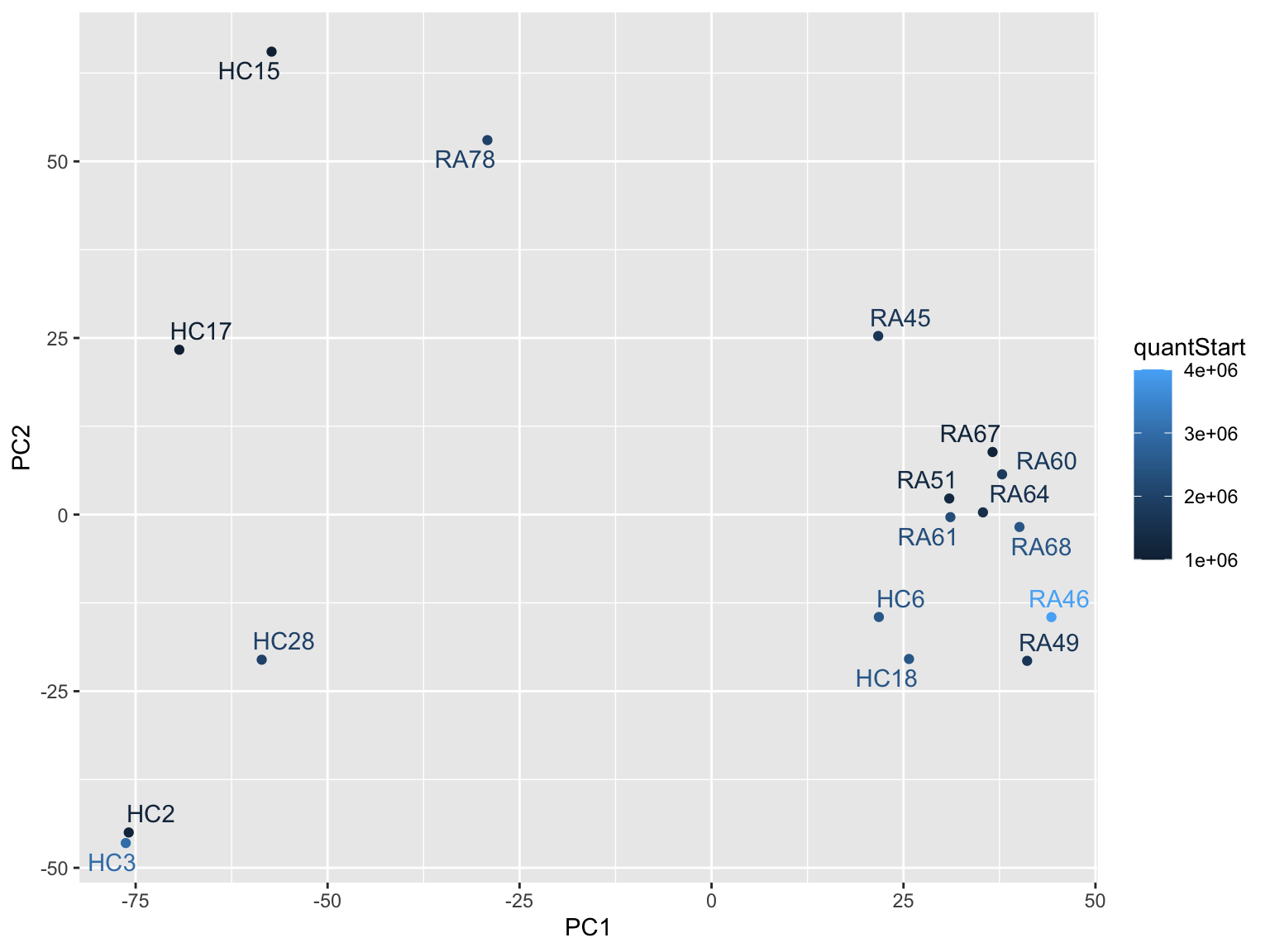 ggplot(plotTab, aes(x=PC1, y=PC2, col = quantStart)) +