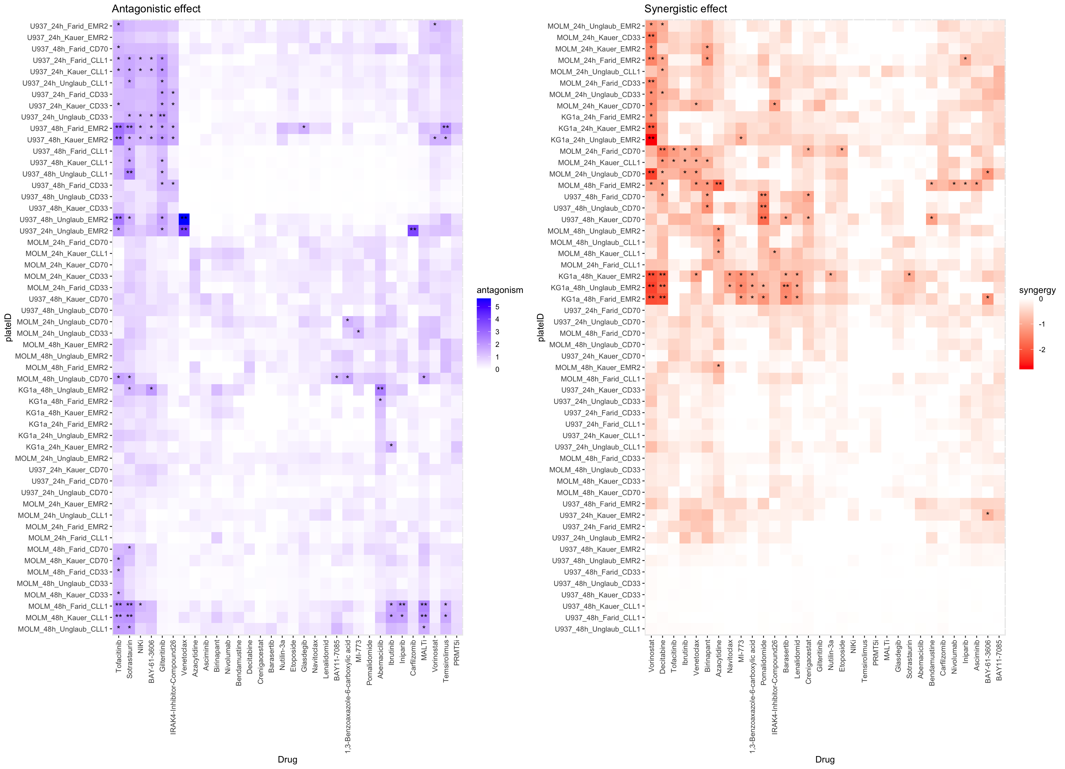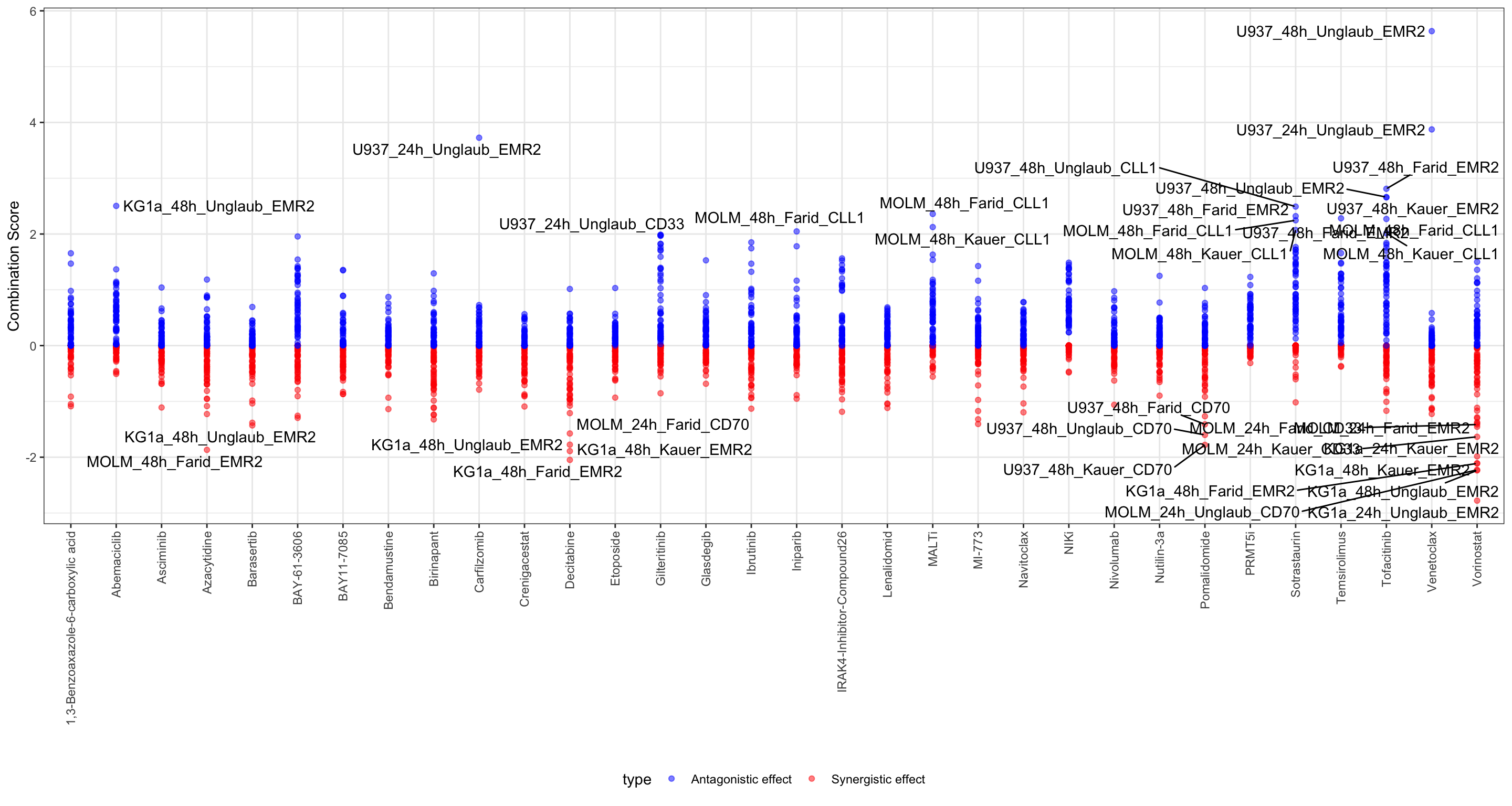 Top 1% synergistics or antagonistic effect are labelled.