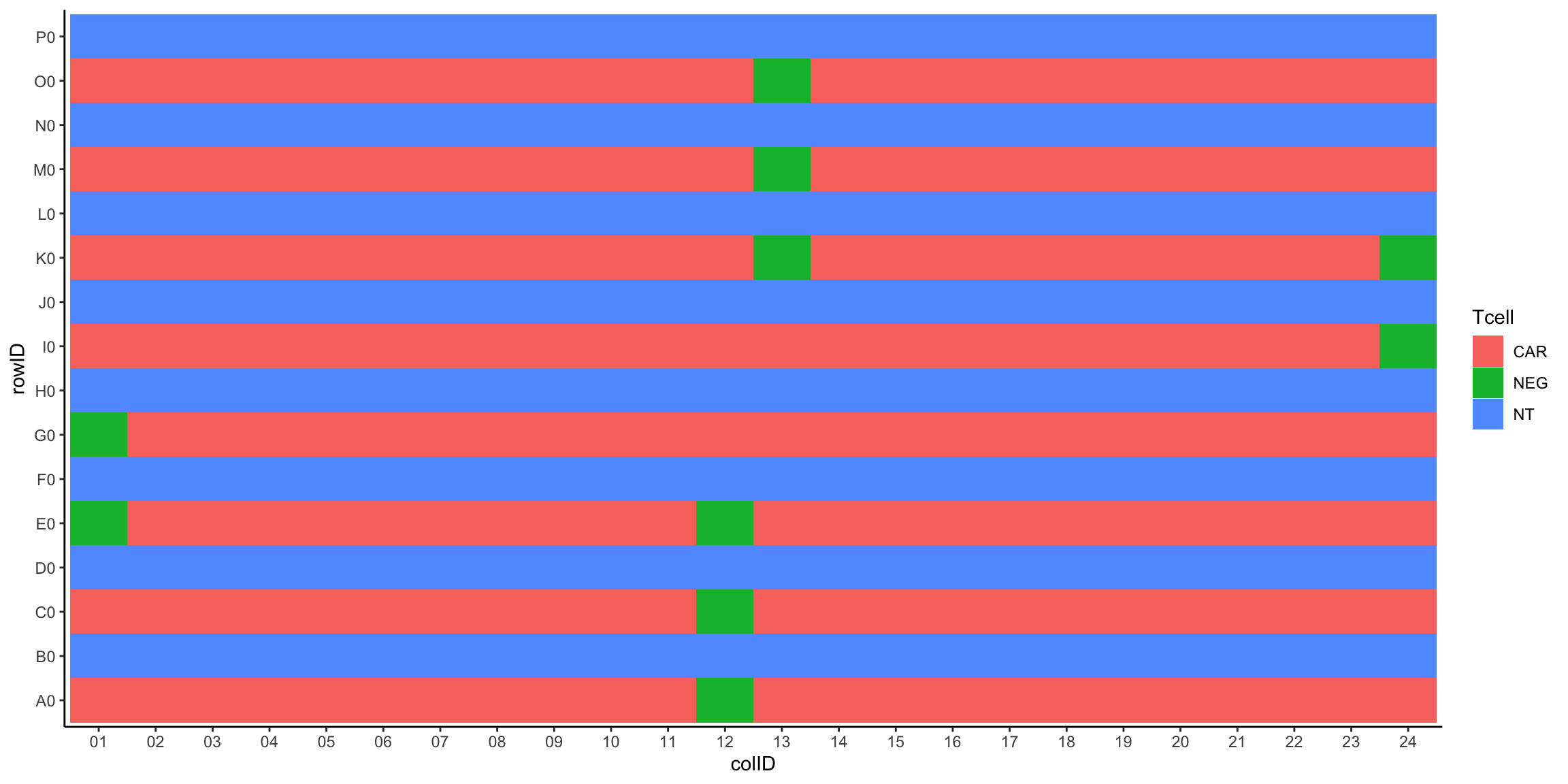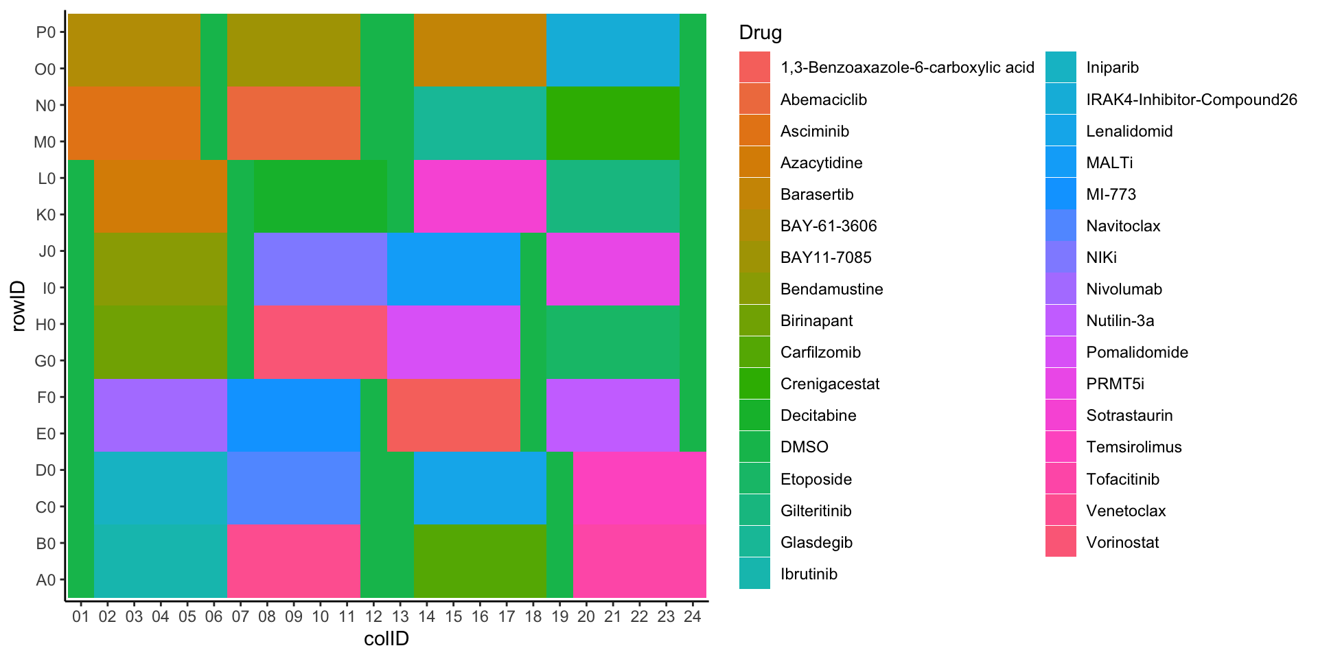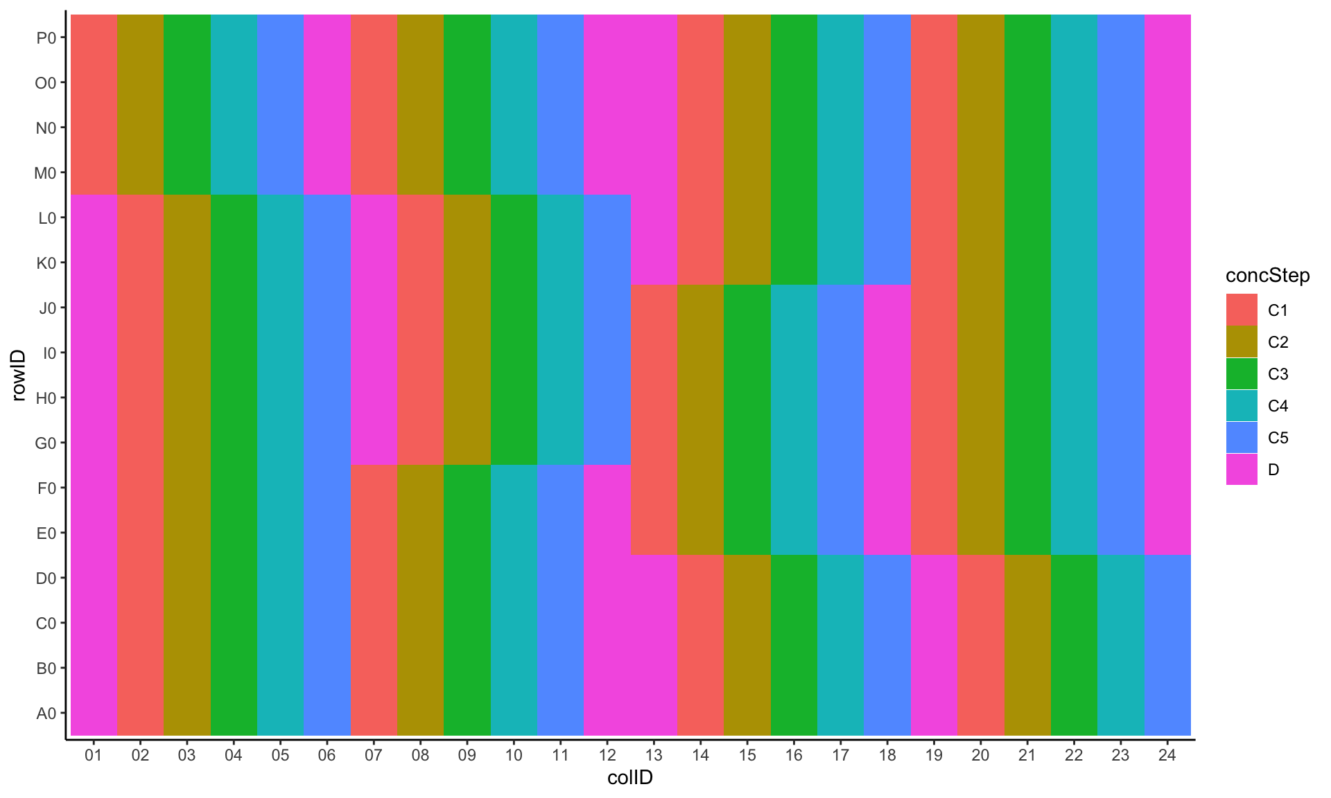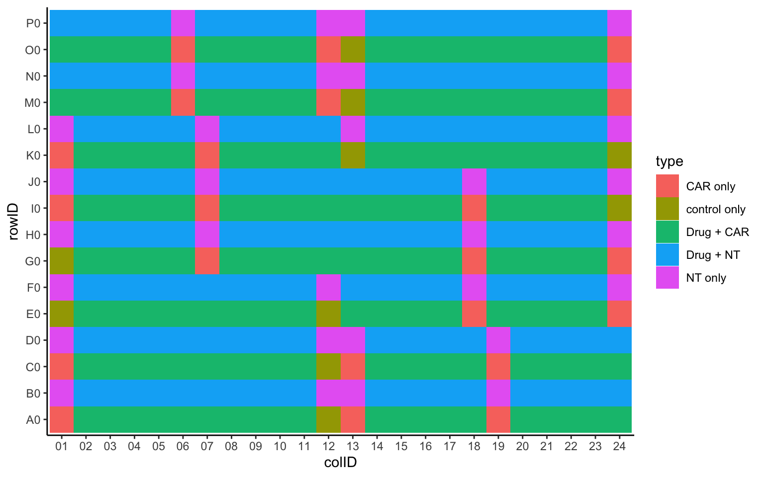 plateLayout <- distinct(screenData, rowID, colID, Drug, Tcell, type, concStep)