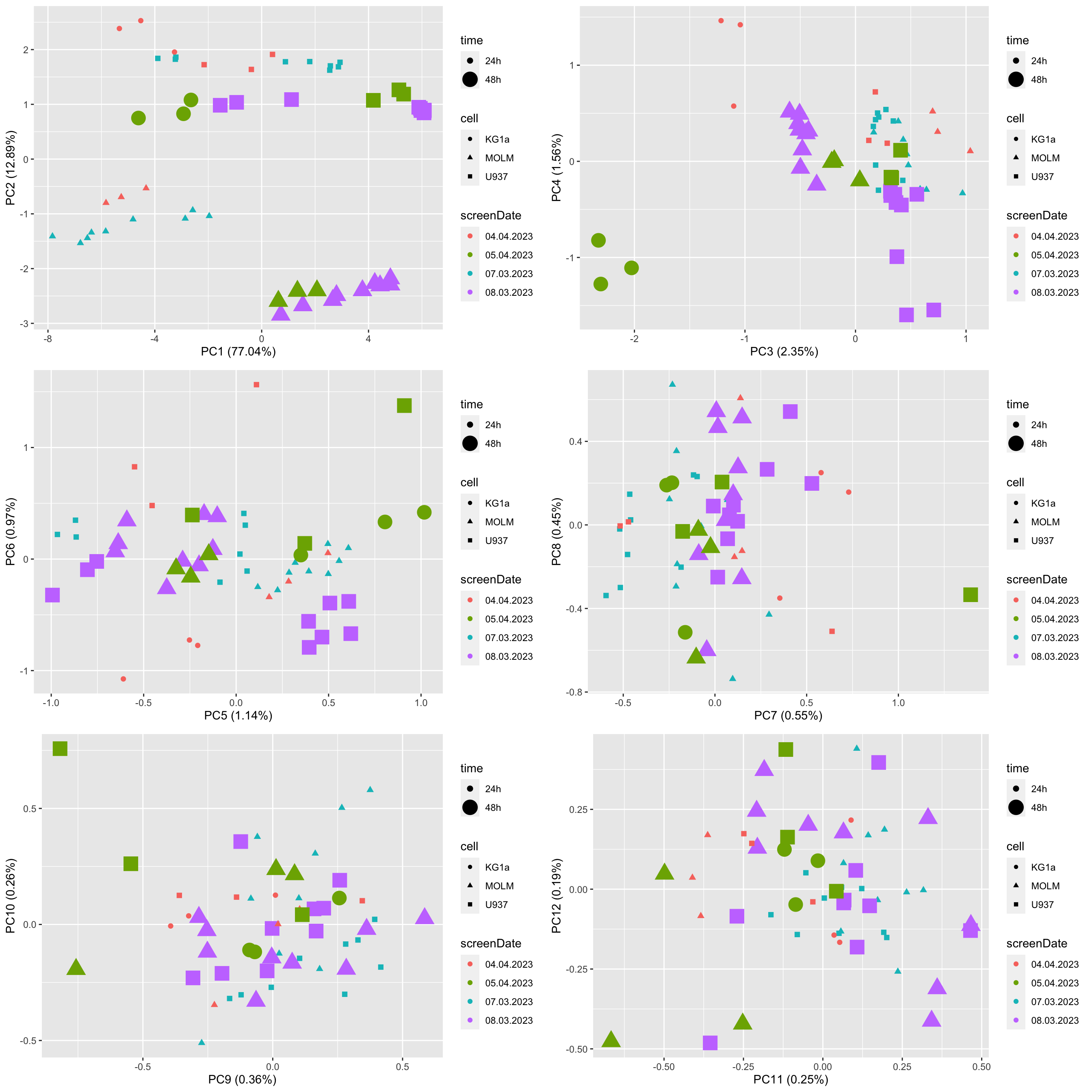 geom_point(aes(col = screenDate, size = time, shape = cell)) +