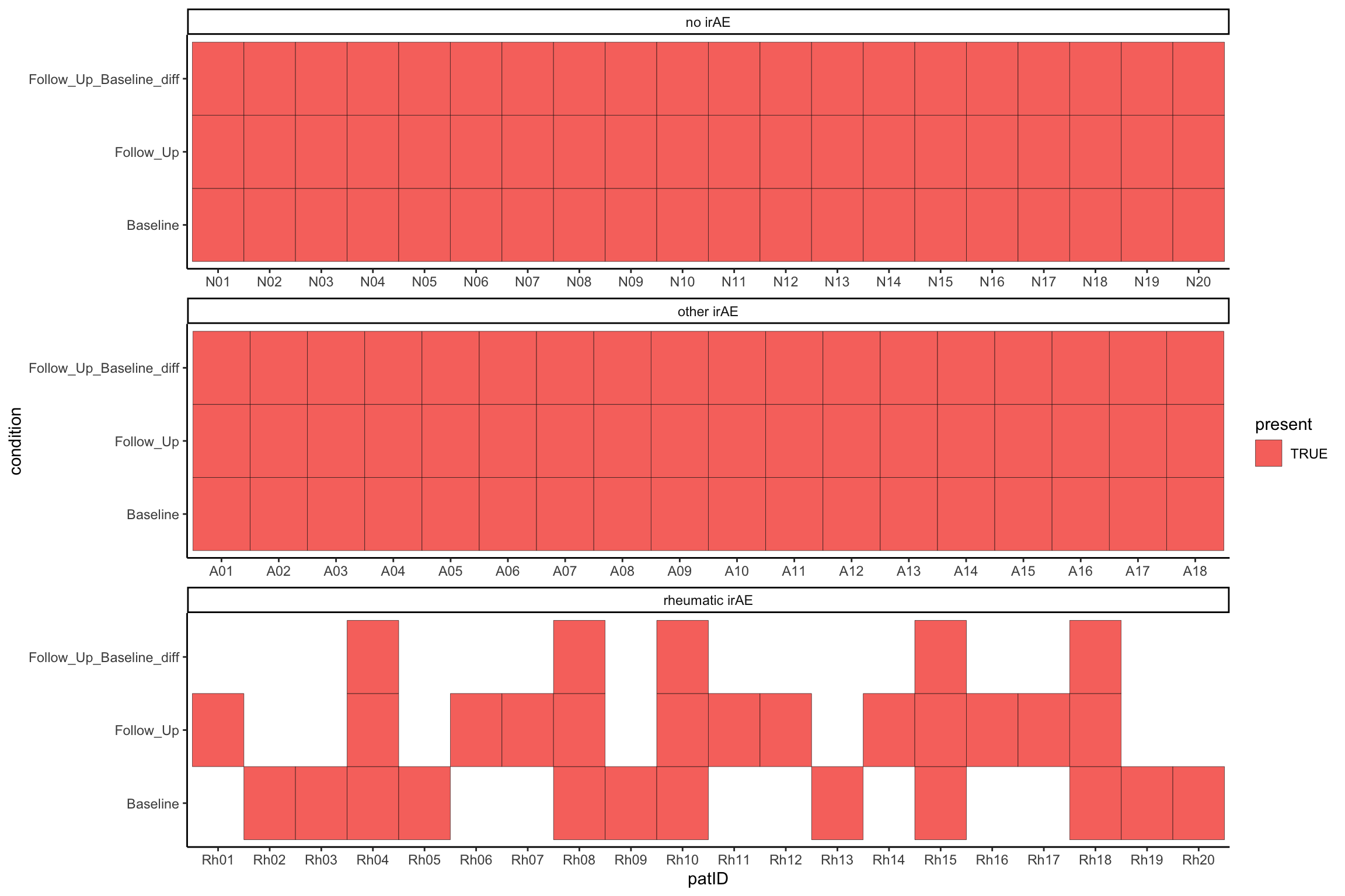 ggplot(plotTab, aes(x=patID, y=condition, fill = present)) +